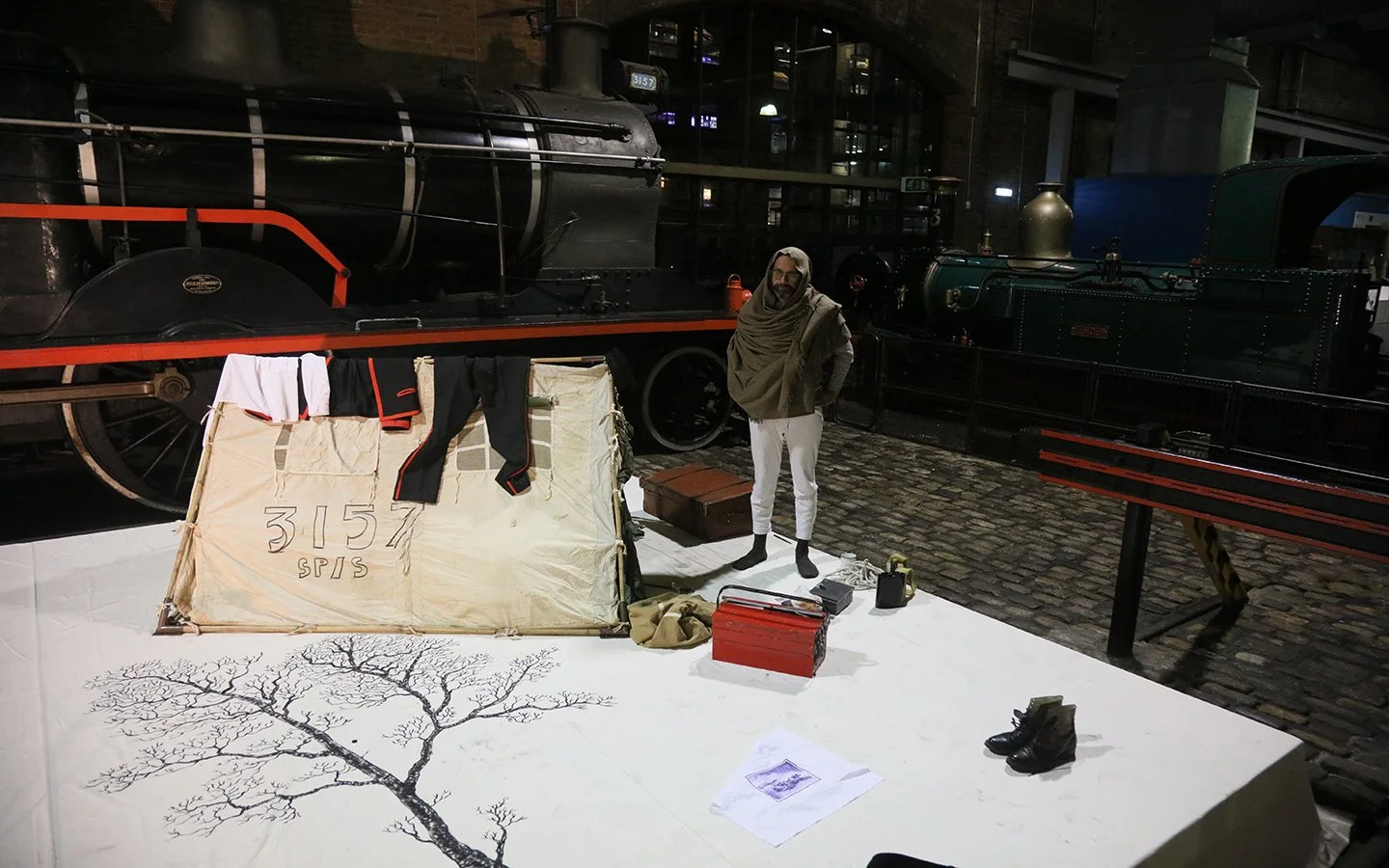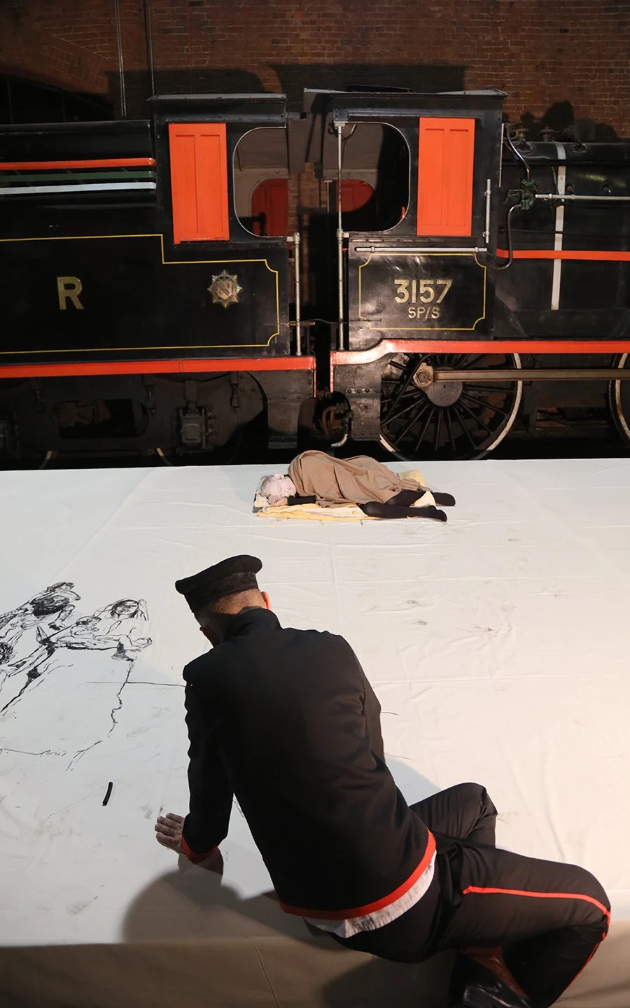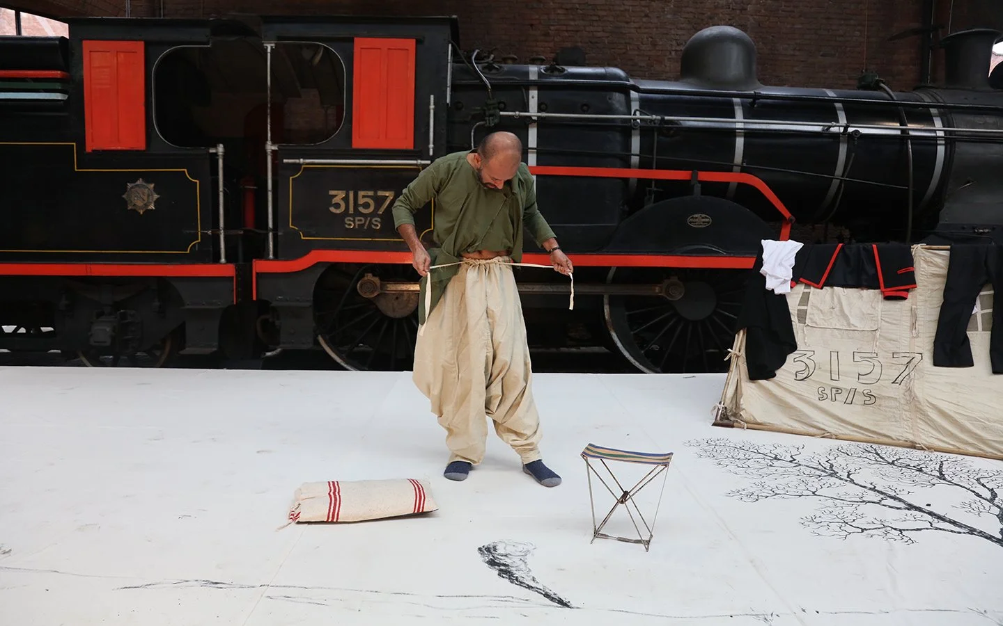 Nikhil spent 48 hours with the locomotive, eating and sleeping in front of it while he created the giant artwork on canvas. The museum remained open 24 hours a day for the duration of the performance, allowing visitors to gain a unique experience of the work. Well known for these long-duration improvised performance pieces, Chopra's work included changing into costumed personas and a large scale, charcoal drawing that will took shape throughout the weekend. He was accompanied by a bespoke soundtrack created by electronic music producer Masta Justy. The Vulcan locomotive was manufactured in Newton-le-Willows in 1911 before being exported to India. Following Partition, it was one of the first locomotives to be used on the newly formed Pakistan Railways where it remained in service until the early 1980s.
