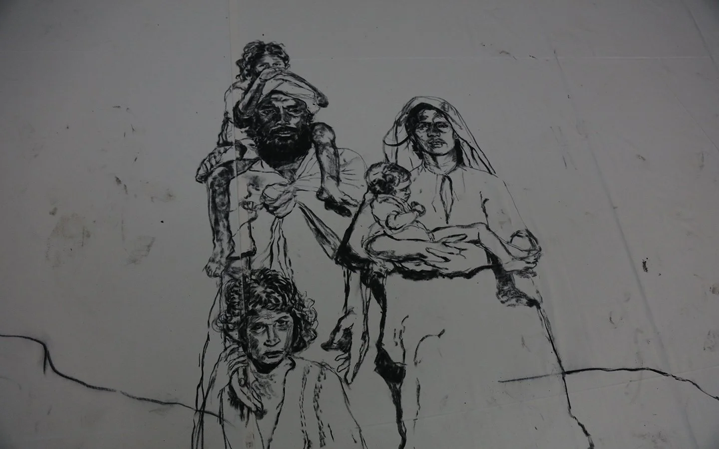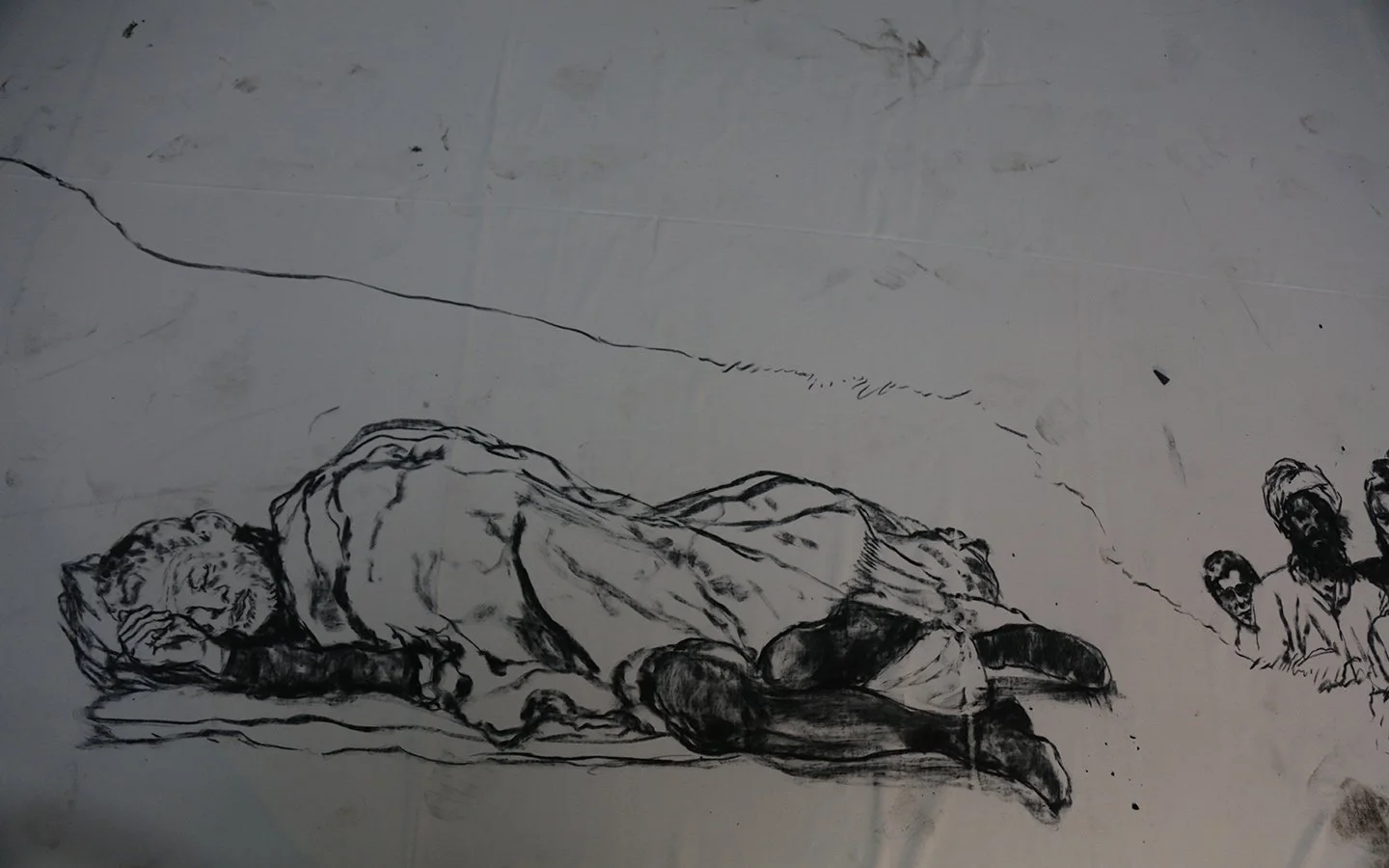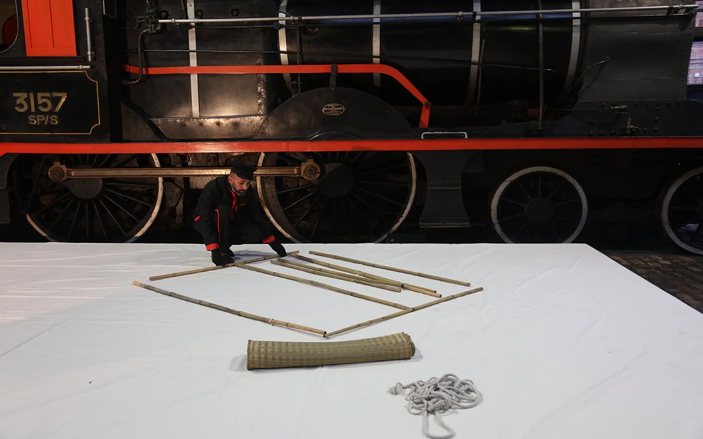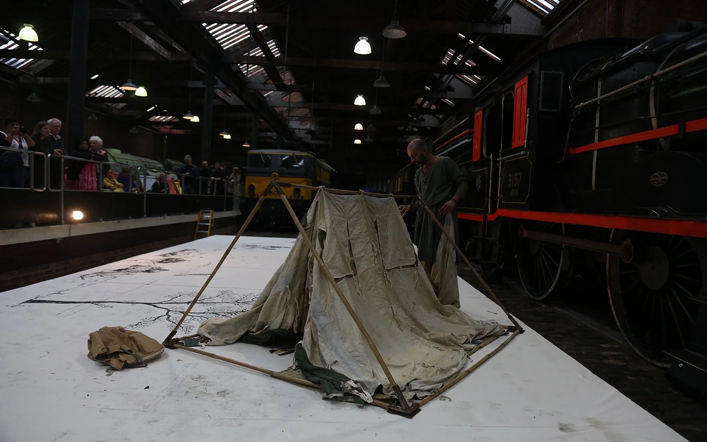 Nikhil spent 48 hours with the locomotive, eating and sleeping in front of it while he created the giant artwork on canvas. The museum remained open 24 hours a day for the duration of the performance, allowing visitors to gain a unique experience of the work. Well known for these long-duration improvised performance pieces, Chopra's work included changing into costumed personas and a large scale, charcoal drawing that will took shape throughout the weekend. He was accompanied by a bespoke soundtrack created by electronic music producer Masta Justy. The Vulcan locomotive was manufactured in Newton-le-Willows in 1911 before being exported to India. Following Partition, it was one of the first locomotives to be used on the newly formed Pakistan Railways where it remained in service until the early 1980s.