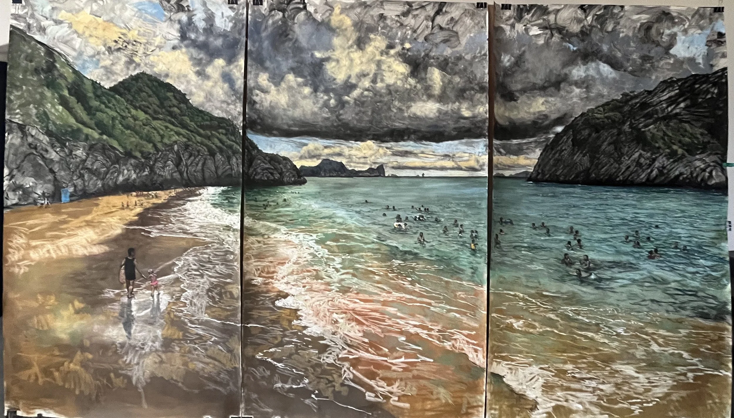 The landscape is no longer lush and dreamy, it rages and burns to black under red-yellow flames and clouds of grey. Fires burn to remind us of primitivity, of coming together and warmth, of invention, but also war and strife, and natural disaster. Charcoal then, a product of charred trees, remains a medium close to this destruction of the pastoral and natural worlds. “