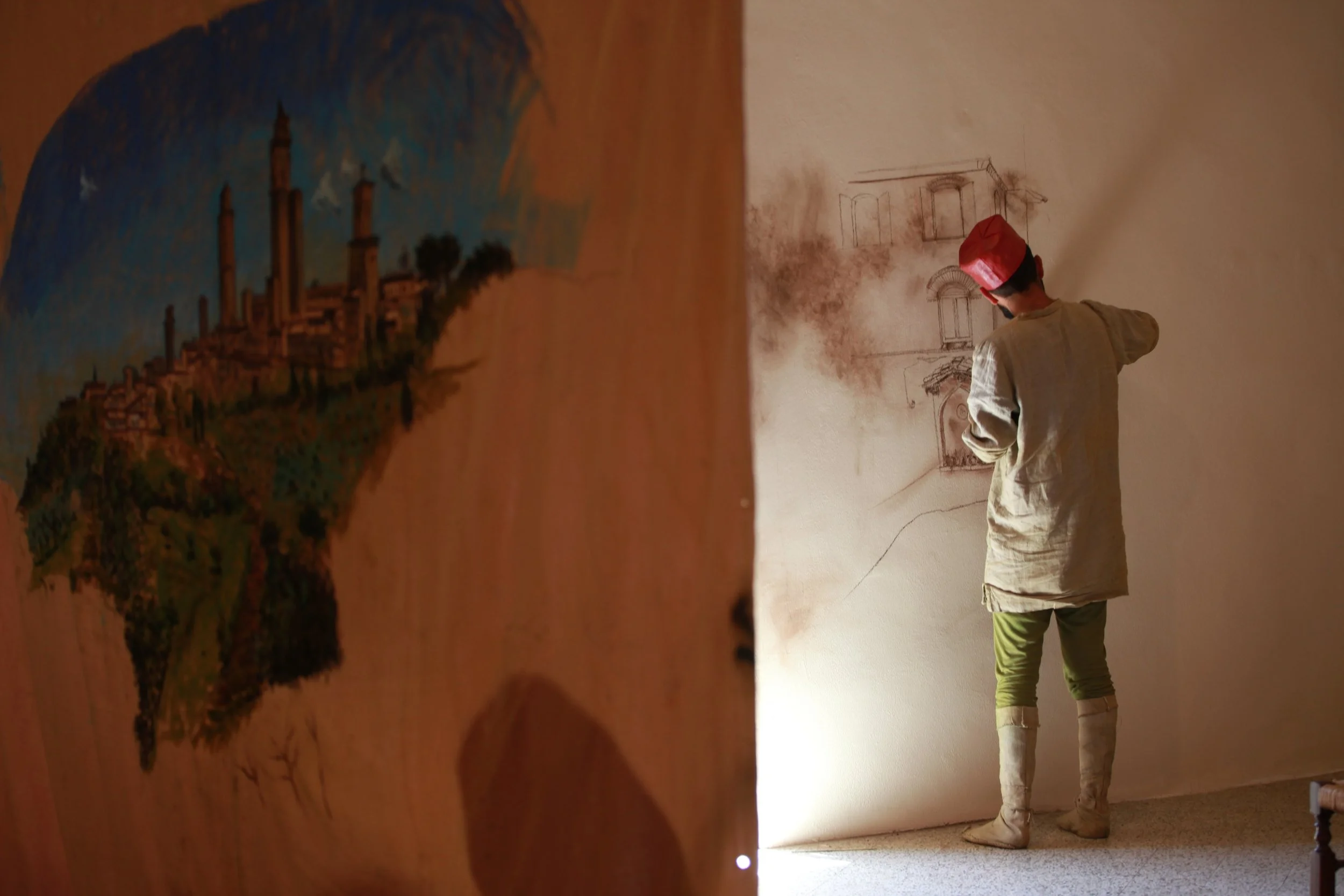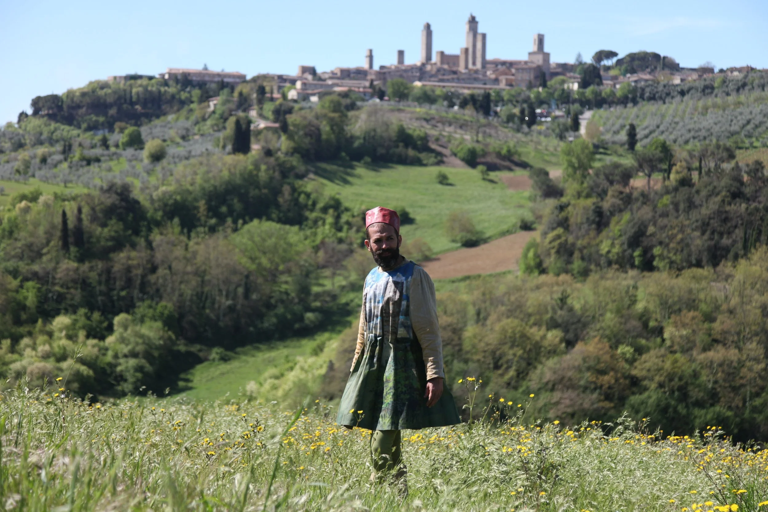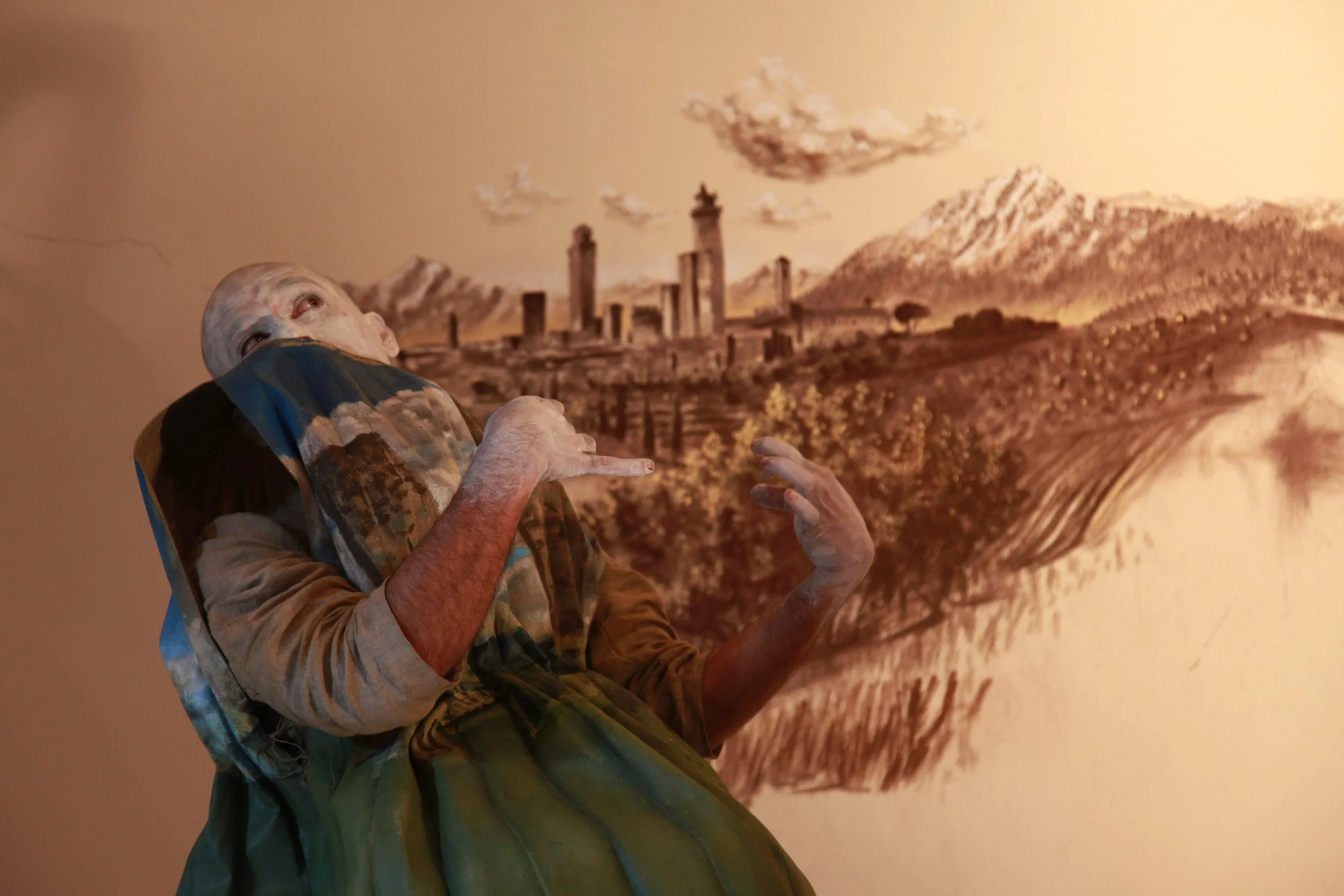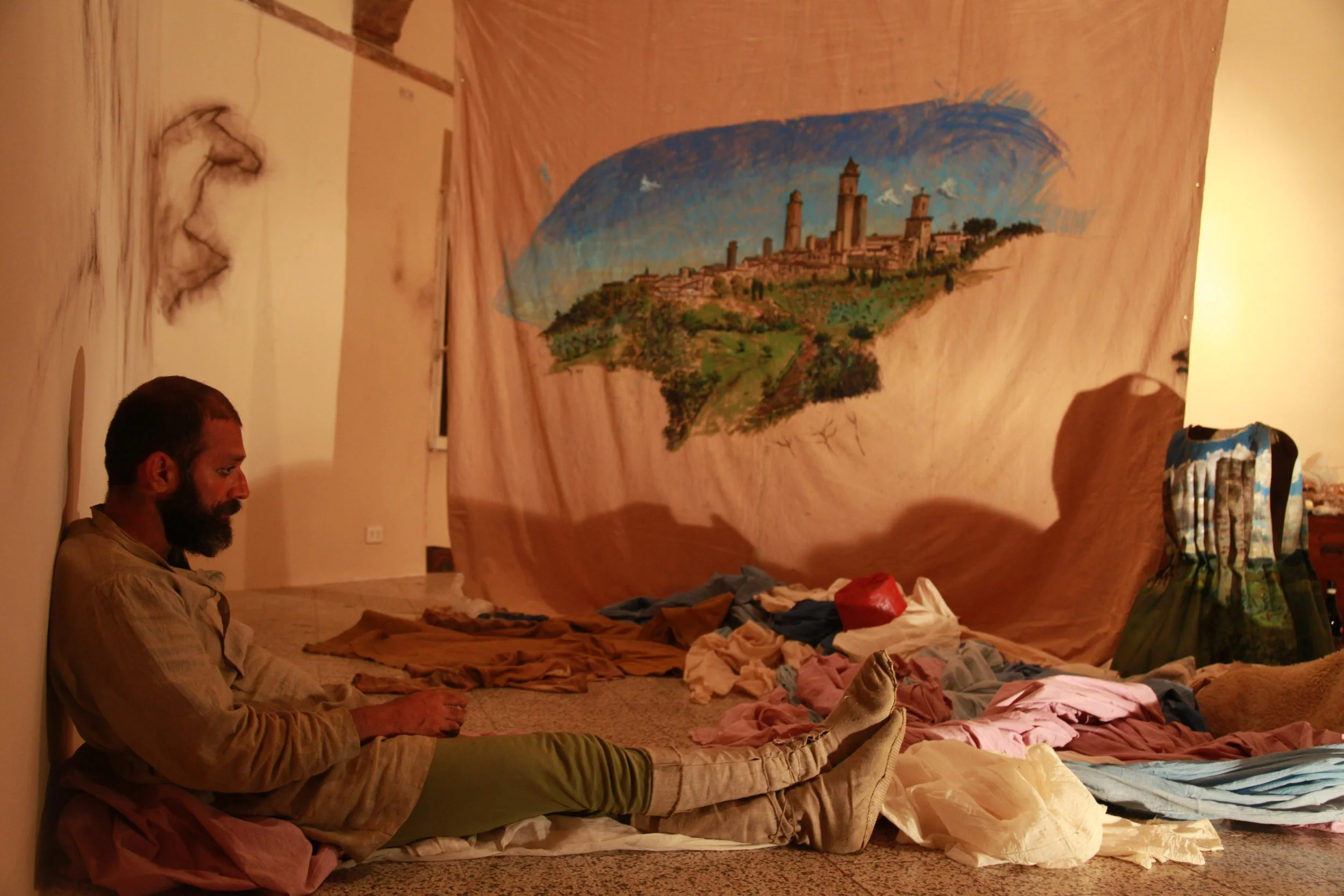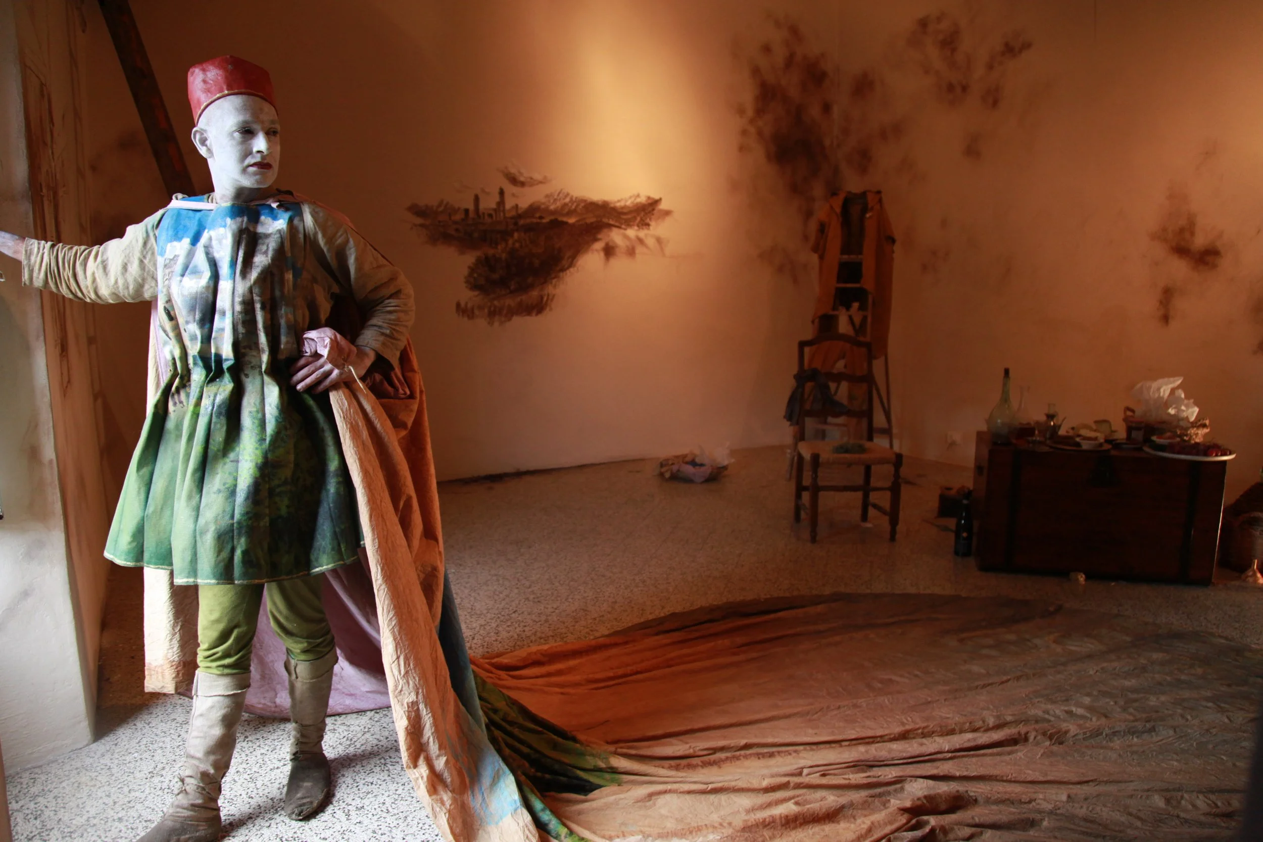 the Church of Sant'Agostino in San Gimignano. Inspired by Gozzoli and his frescos inside out is a site-specific performance conceived by Chopra for the Galleria Continua in San Gimignano. The performance, the longest realized to date by the artist, will last for 99 hours, beginning at 11 am on Wednesday 25 April and ending at 2 pm on Sunday 29 April. During this period of time, the artist will assume the guise of different personae to embody history and memory, and will walk around in the streets of the town and in the surrounding area. In the course of the performance, Chopra will produce a series of drawings of San Gimignano and of the Tuscan landscape. The drawings and their installation will be executed both outside and inside the Arco dei Becci exhibition space, which will be the artist’s abode for the duration of the performance. The installation, the result of four days of performance, will remain on public display until 20 August 2012. The costumes for the performance inside out are designed by Sabine Pfisterer.