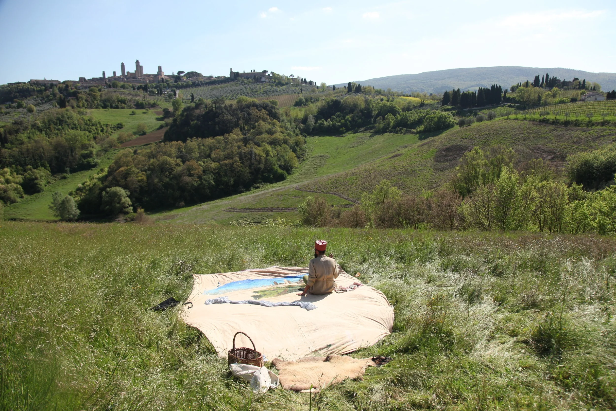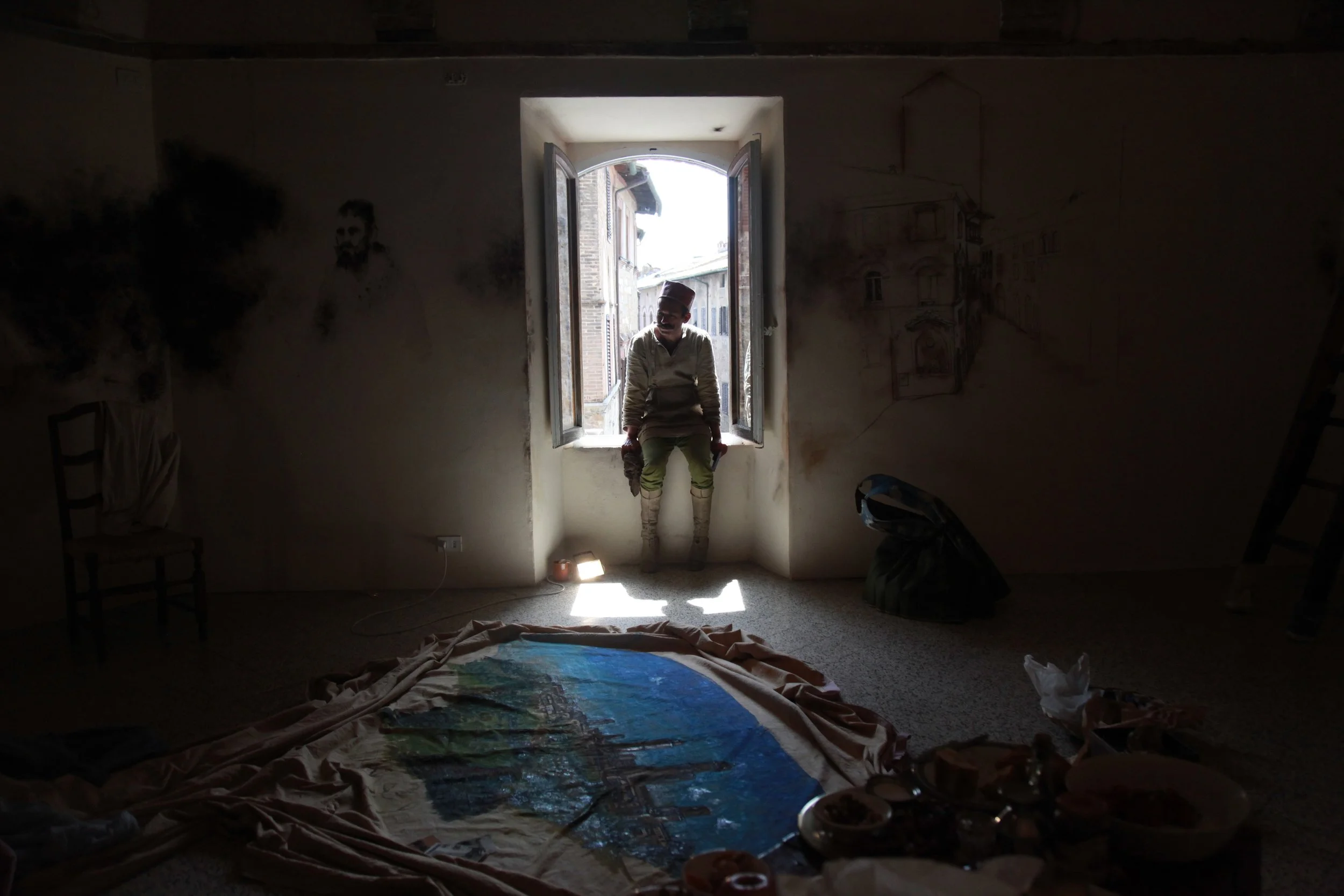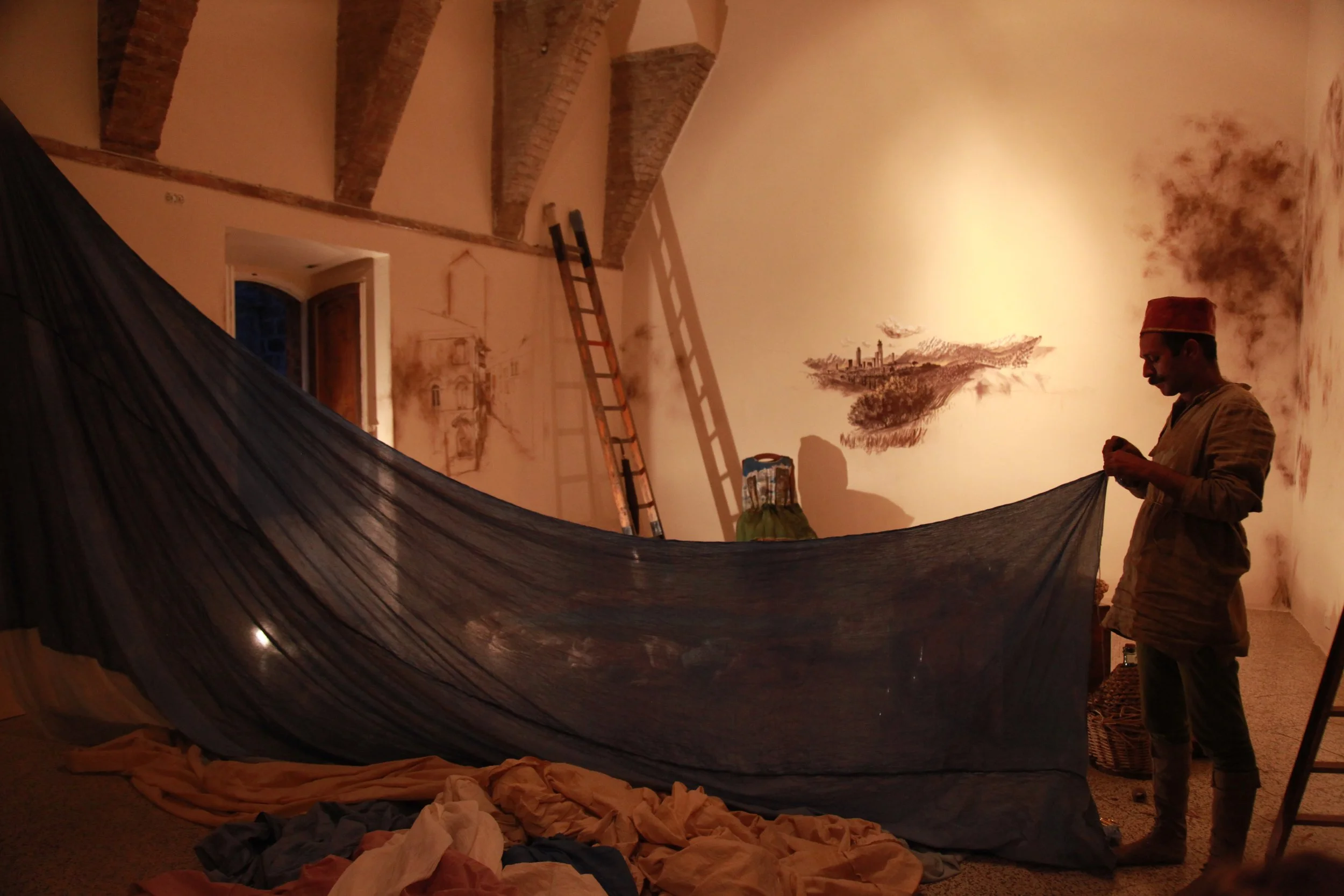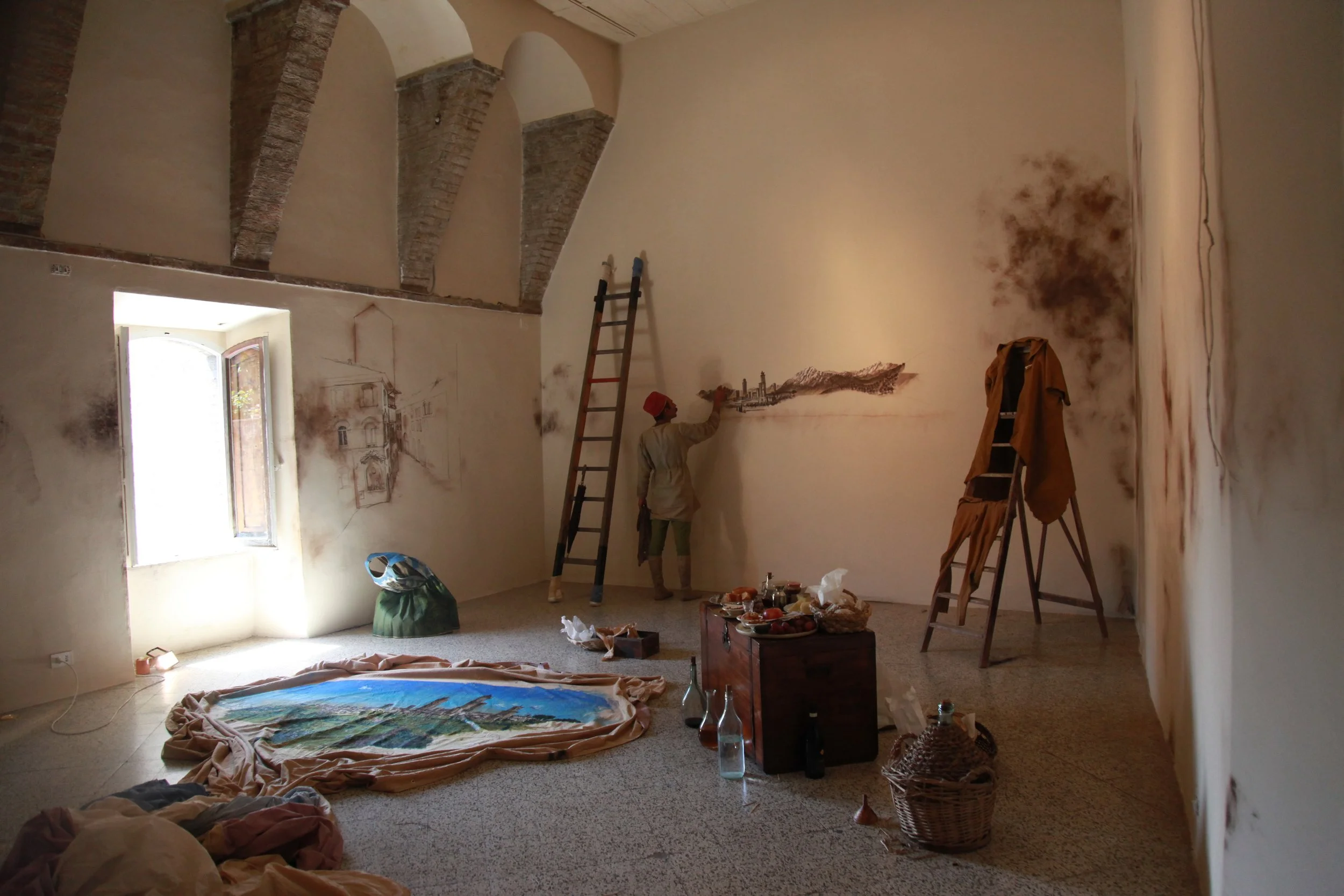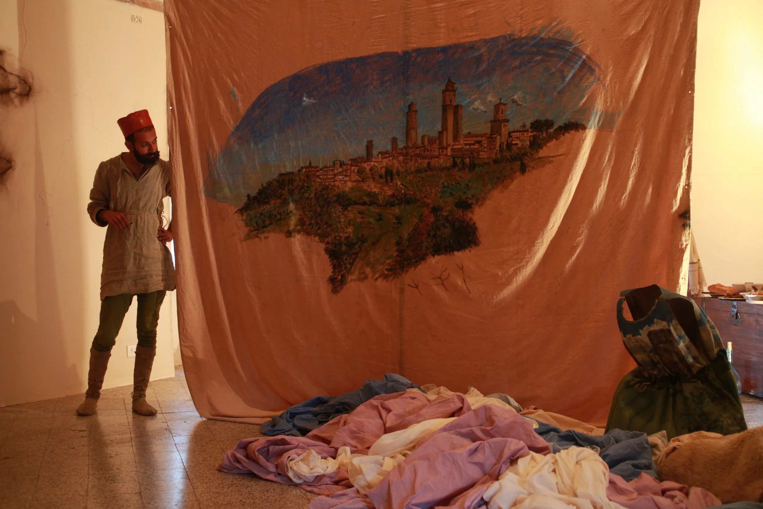 the Church of Sant'Agostino in San Gimignano. Inspired by Gozzoli and his frescos inside out is a site-specific performance conceived by Chopra for the Galleria Continua in San Gimignano. The performance, the longest realized to date by the artist, will last for 99 hours, beginning at 11 am on Wednesday 25 April and ending at 2 pm on Sunday 29 April. During this period of time, the artist will assume the guise of different personae to embody history and memory, and will walk around in the streets of the town and in the surrounding area. In the course of the performance, Chopra will produce a series of drawings of San Gimignano and of the Tuscan landscape. The drawings and their installation will be executed both outside and inside the Arco dei Becci exhibition space, which will be the artist’s abode for the duration of the performance. The installation, the result of four days of performance, will remain on public display until 20 August 2012. The costumes for the performance inside out are designed by Sabine Pfisterer.
