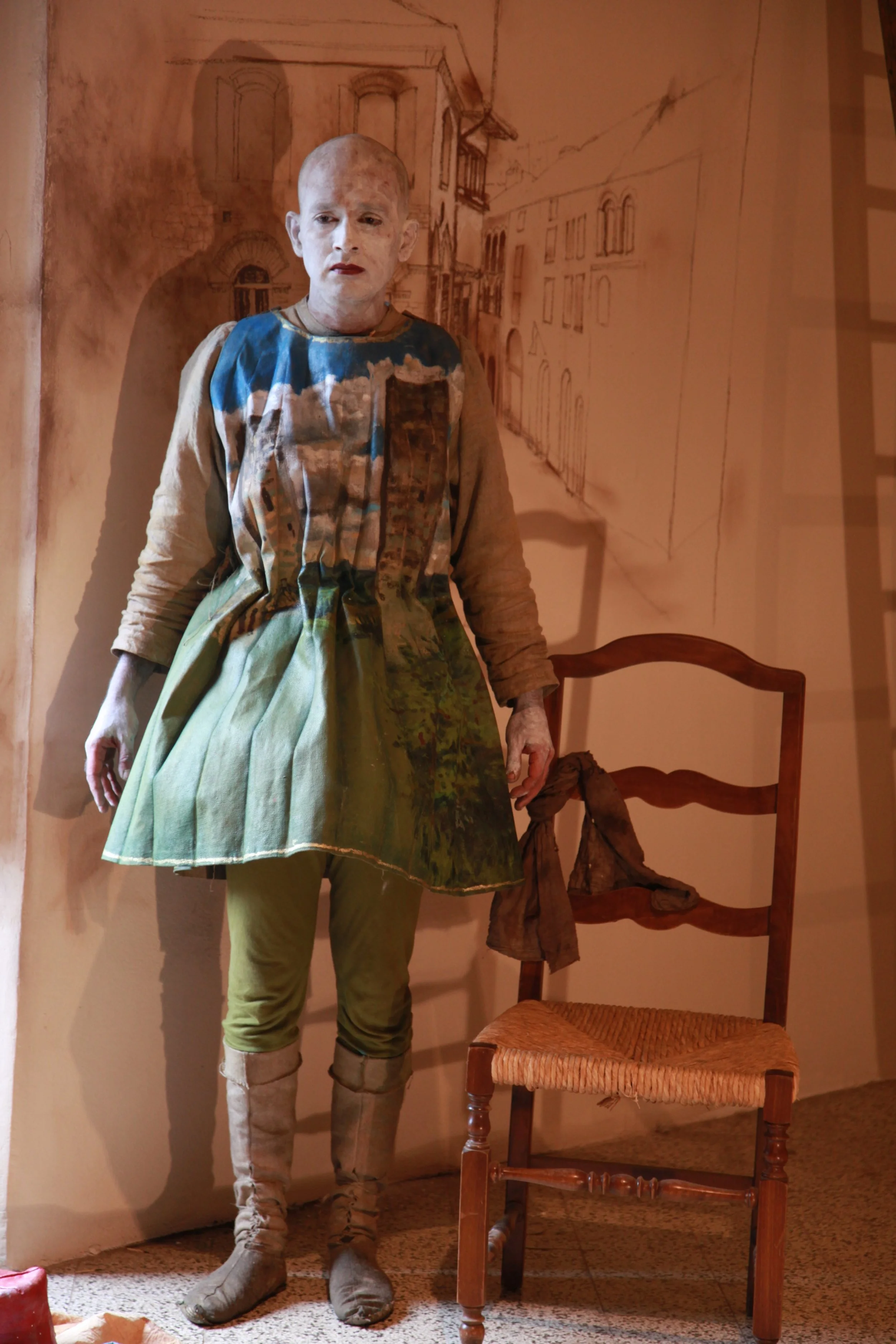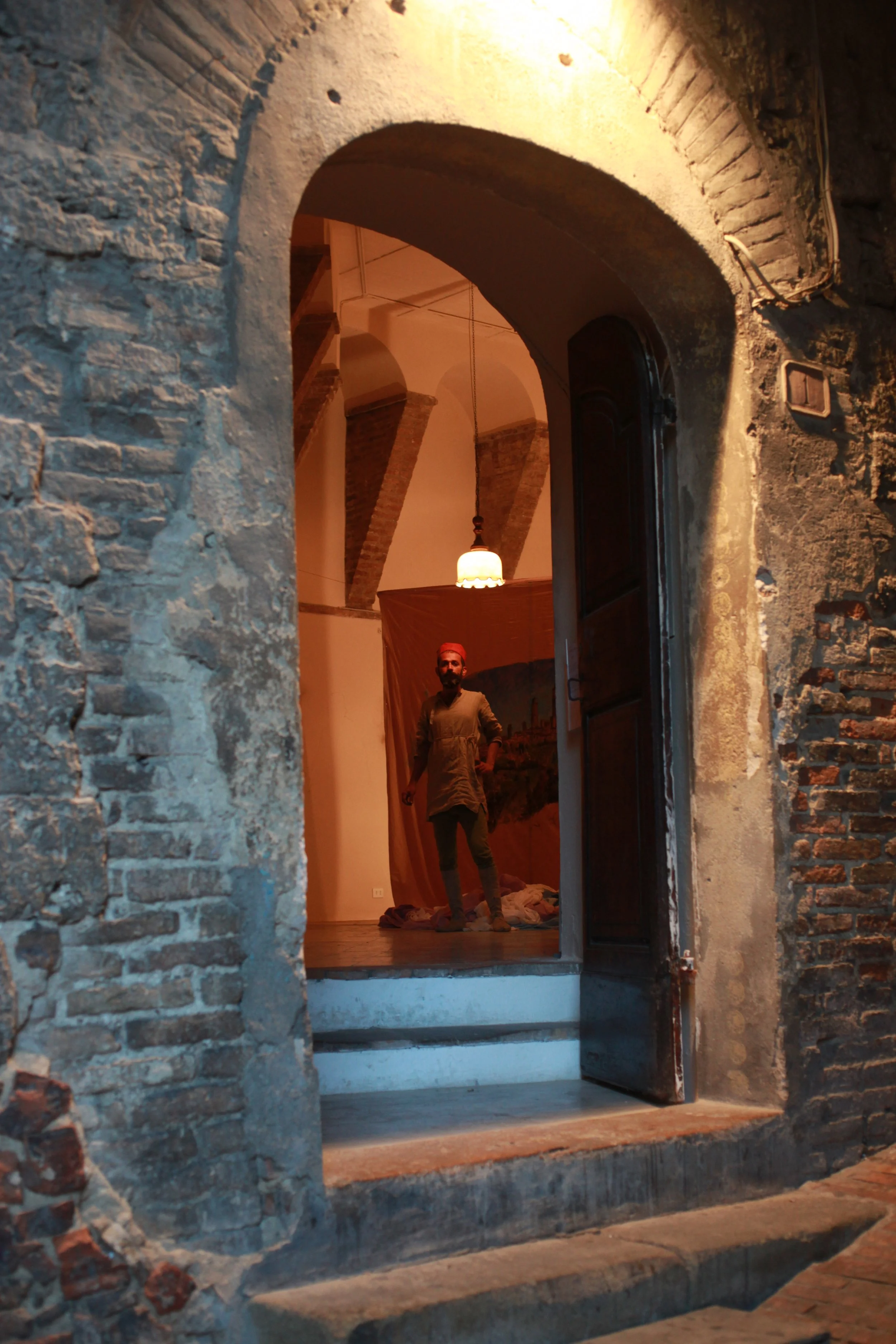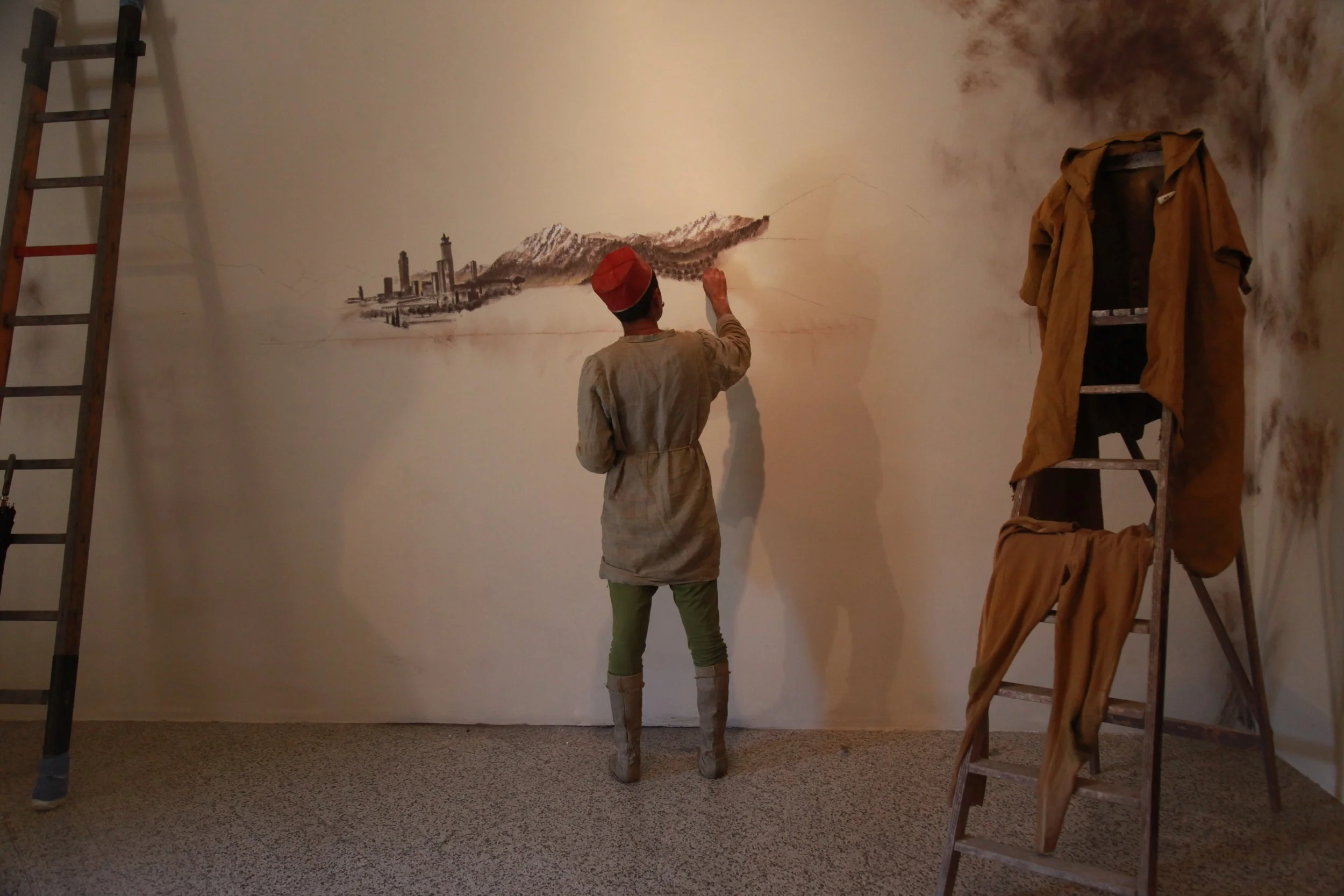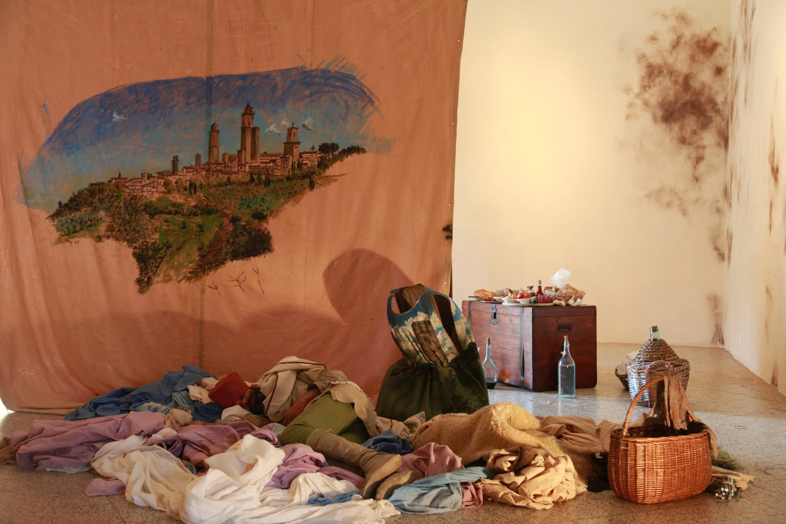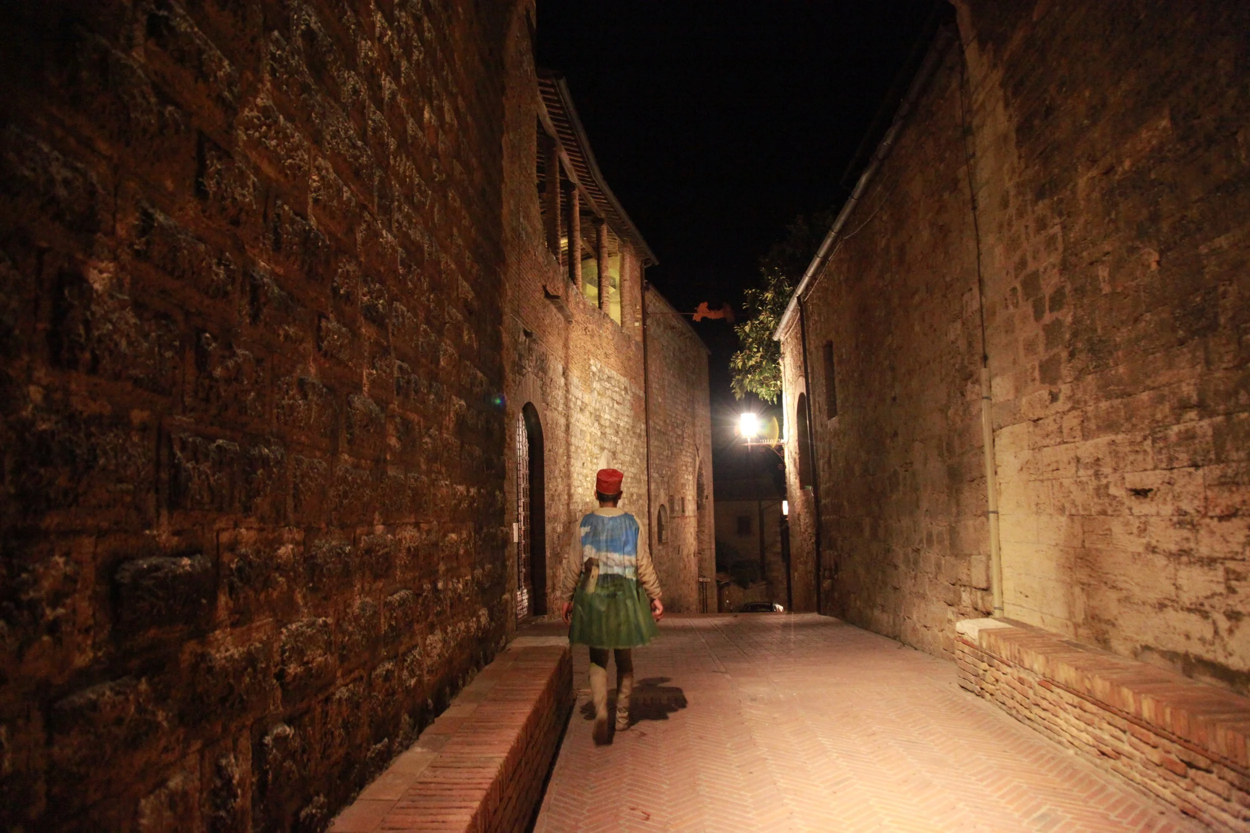 the Church of Sant'Agostino in San Gimignano. Inspired by Gozzoli and his frescos inside out is a site-specific performance conceived by Chopra for the Galleria Continua in San Gimignano. The performance, the longest realized to date by the artist, will last for 99 hours, beginning at 11 am on Wednesday 25 April and ending at 2 pm on Sunday 29 April. During this period of time, the artist will assume the guise of different personae to embody history and memory, and will walk around in the streets of the town and in the surrounding area. In the course of the performance, Chopra will produce a series of drawings of San Gimignano and of the Tuscan landscape. The drawings and their installation will be executed both outside and inside the Arco dei Becci exhibition space, which will be the artist’s abode for the duration of the performance. The installation, the result of four days of performance, will remain on public display until 20 August 2012. The costumes for the performance inside out are designed by Sabine Pfisterer.