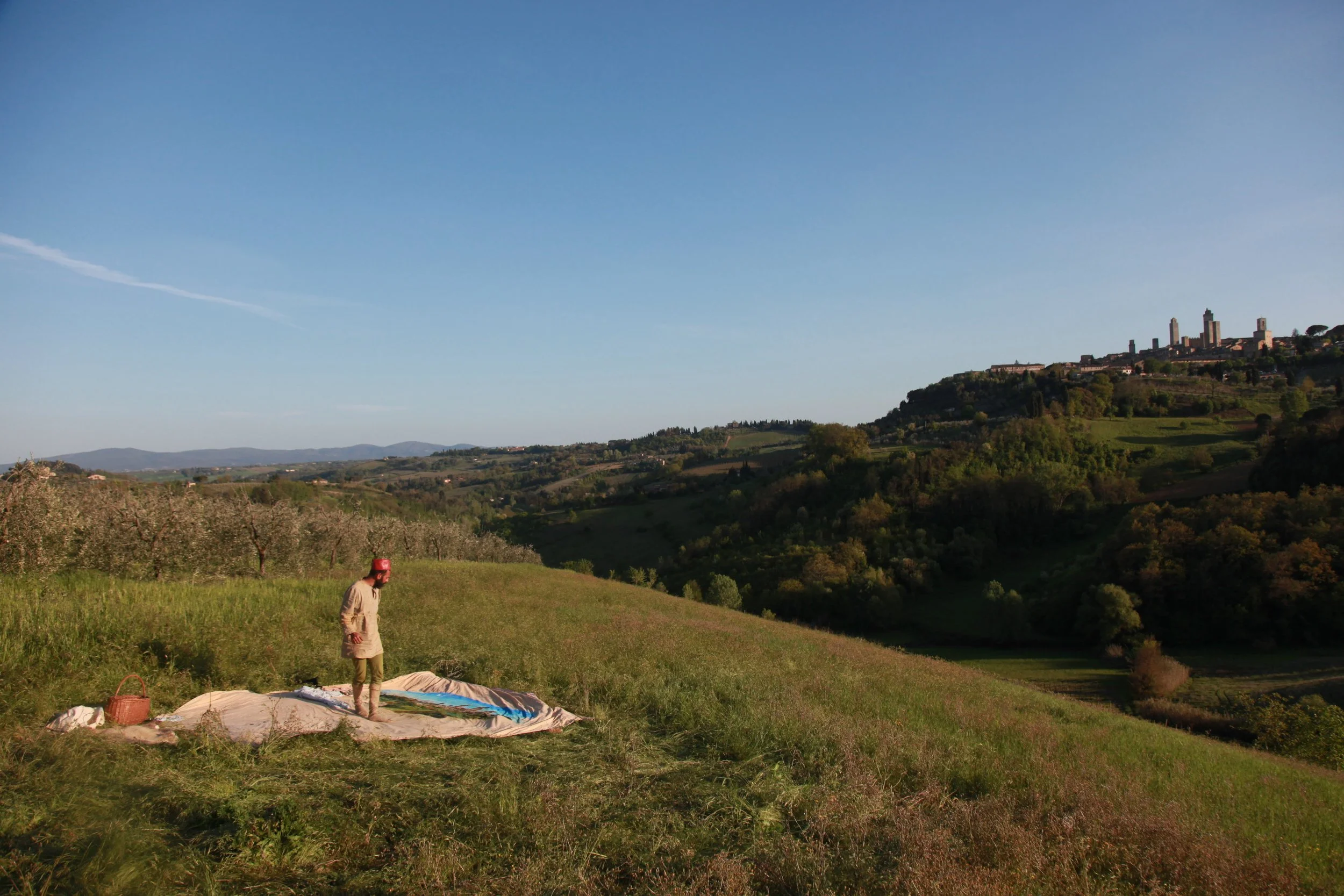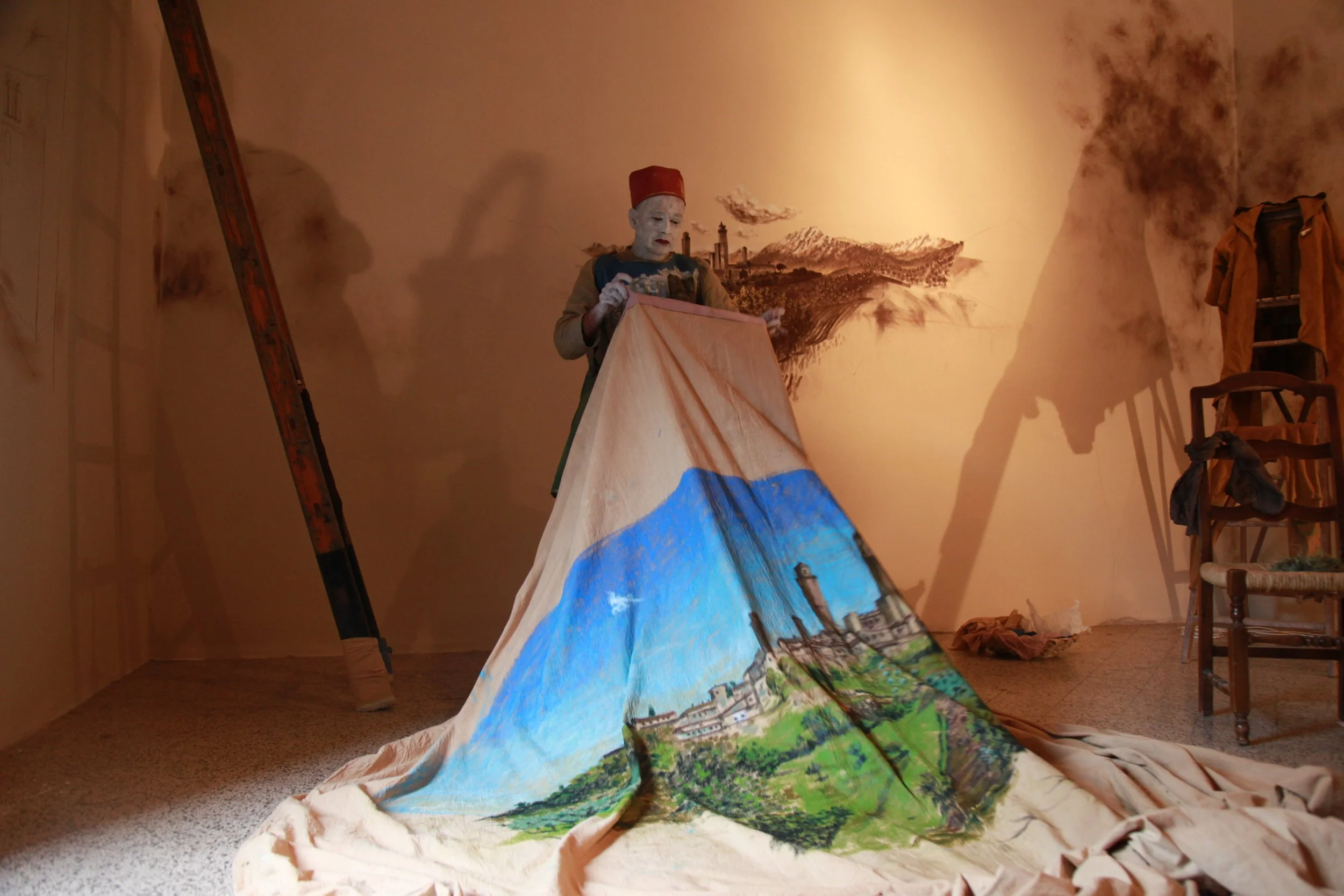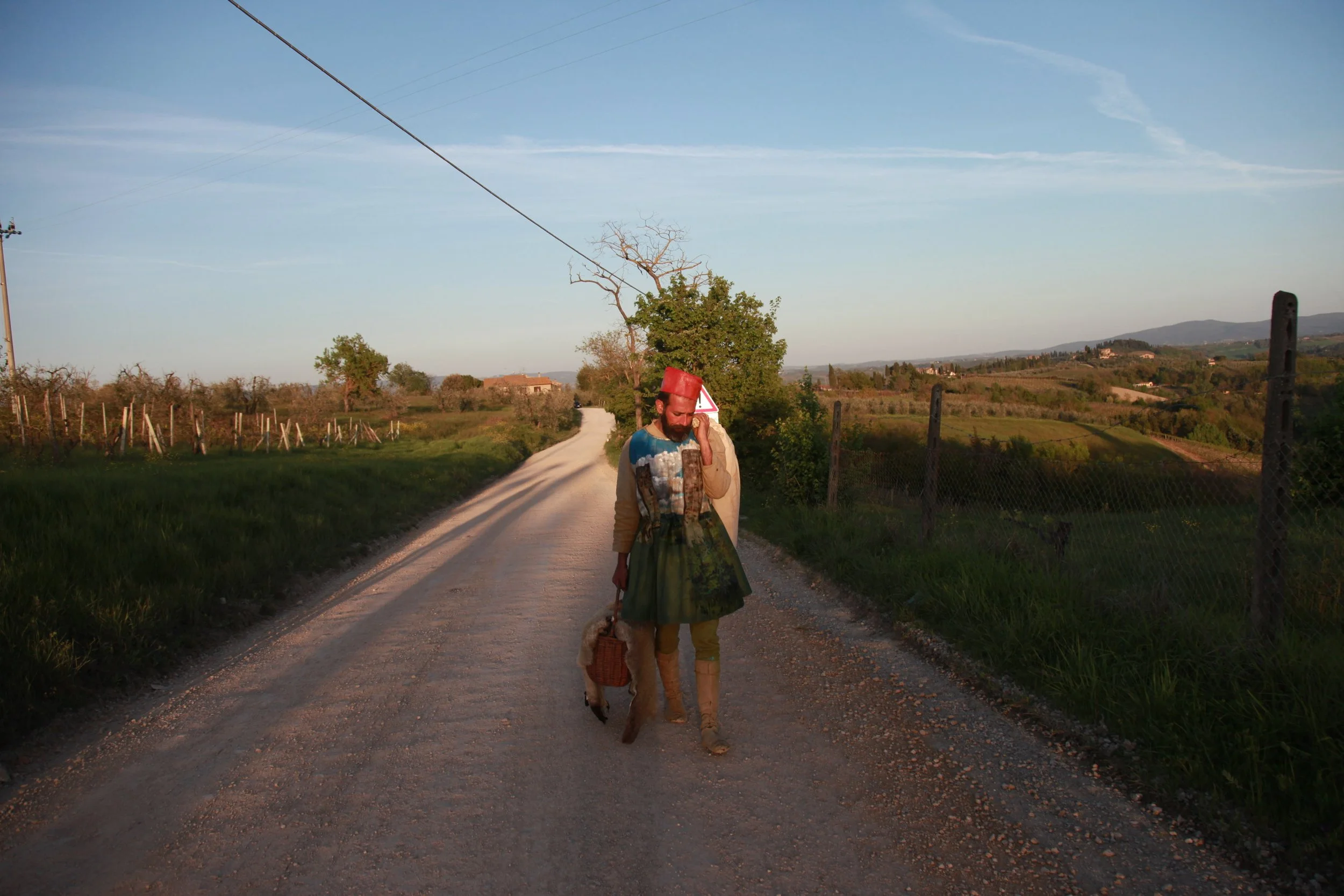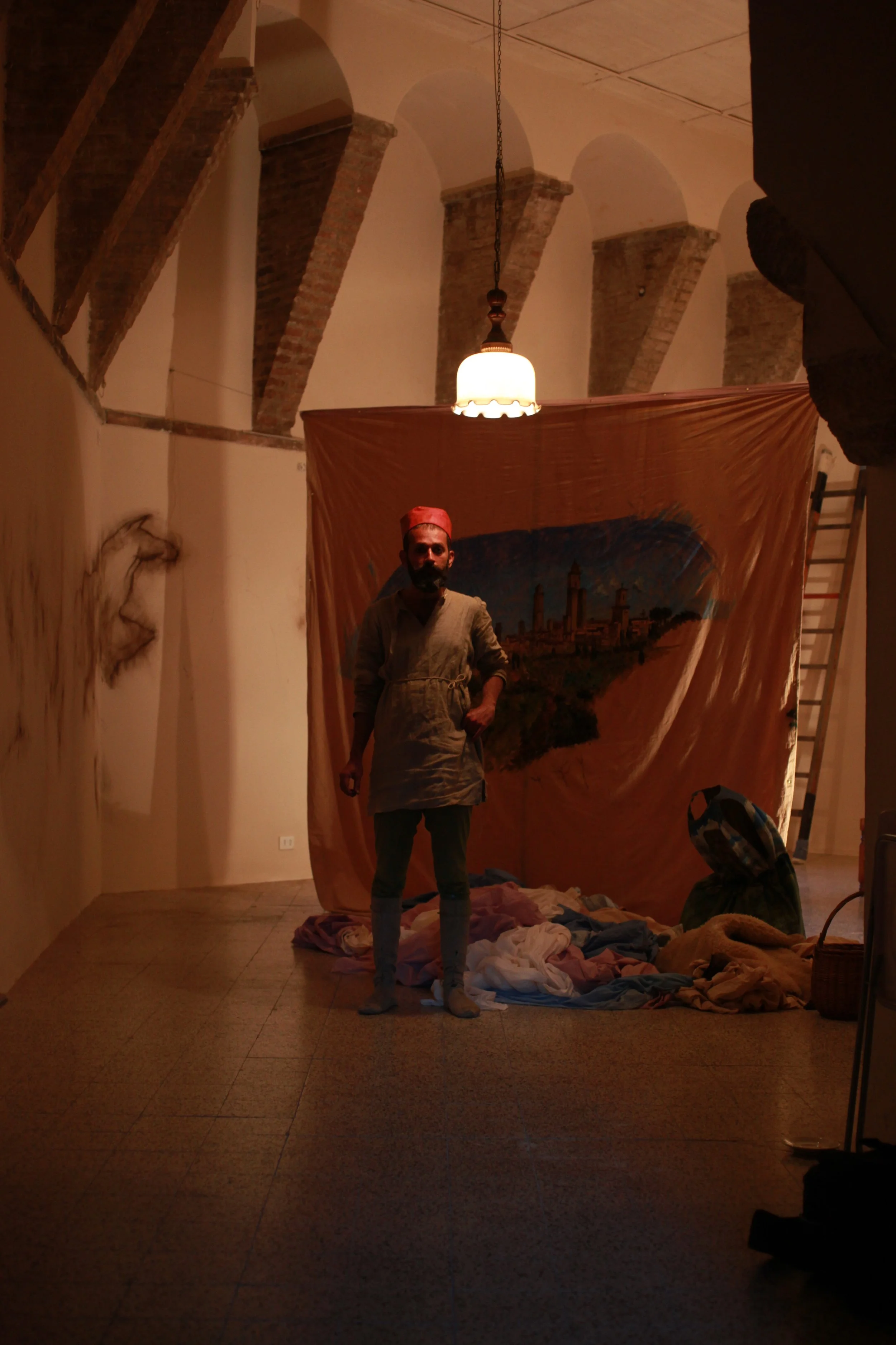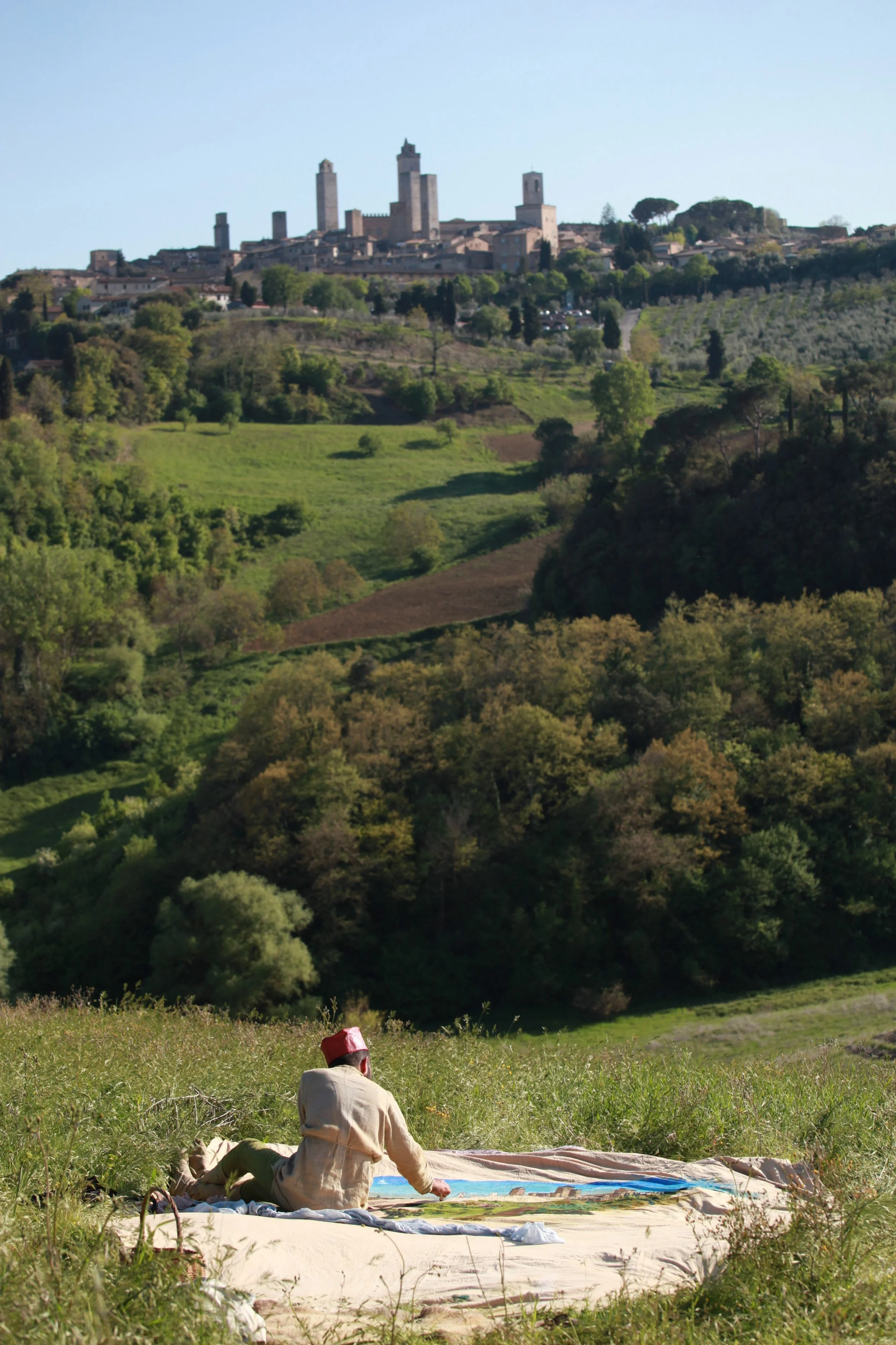 the Church of Sant'Agostino in San Gimignano. Inspired by Gozzoli and his frescos inside out is a site-specific performance conceived by Chopra for the Galleria Continua in San Gimignano. The performance, the longest realized to date by the artist, will last for 99 hours, beginning at 11 am on Wednesday 25 April and ending at 2 pm on Sunday 29 April. During this period of time, the artist will assume the guise of different personae to embody history and memory, and will walk around in the streets of the town and in the surrounding area. In the course of the performance, Chopra will produce a series of drawings of San Gimignano and of the Tuscan landscape. The drawings and their installation will be executed both outside and inside the Arco dei Becci exhibition space, which will be the artist’s abode for the duration of the performance. The installation, the result of four days of performance, will remain on public display until 20 August 2012. The costumes for the performance inside out are designed by Sabine Pfisterer.