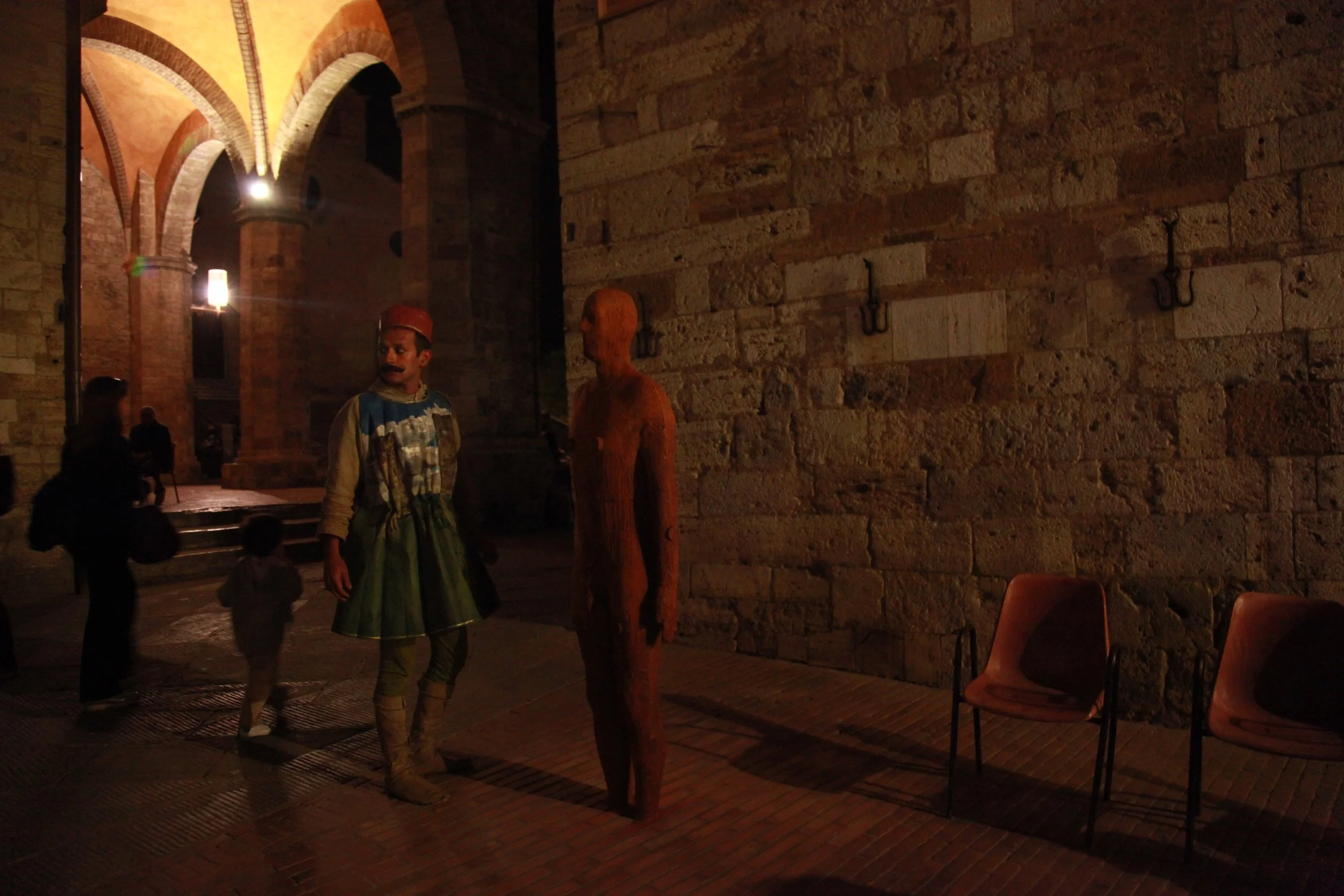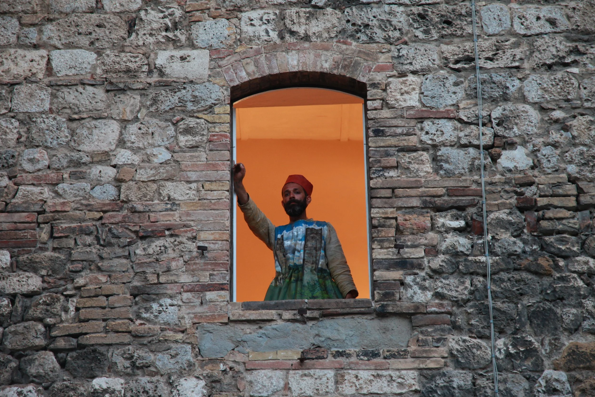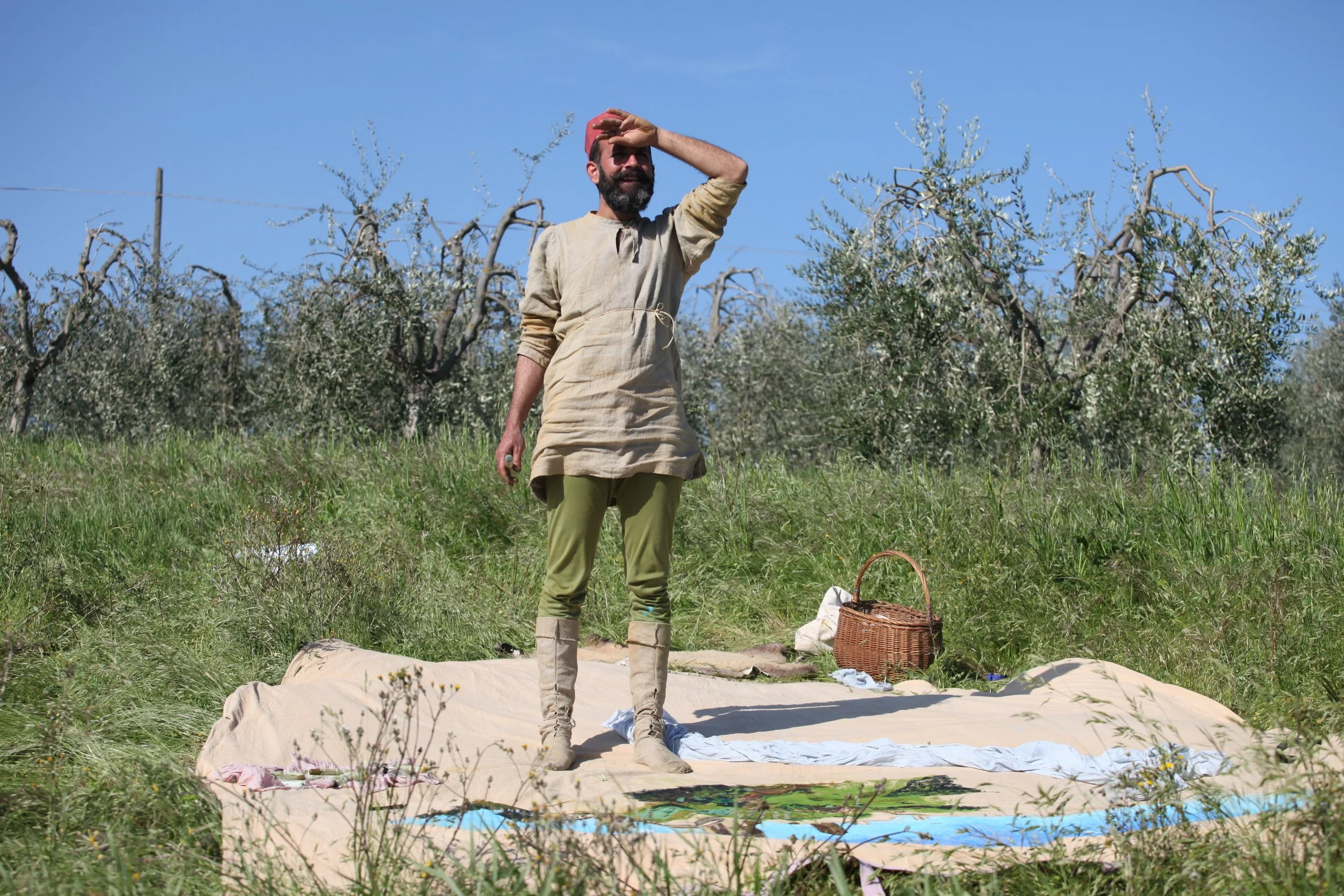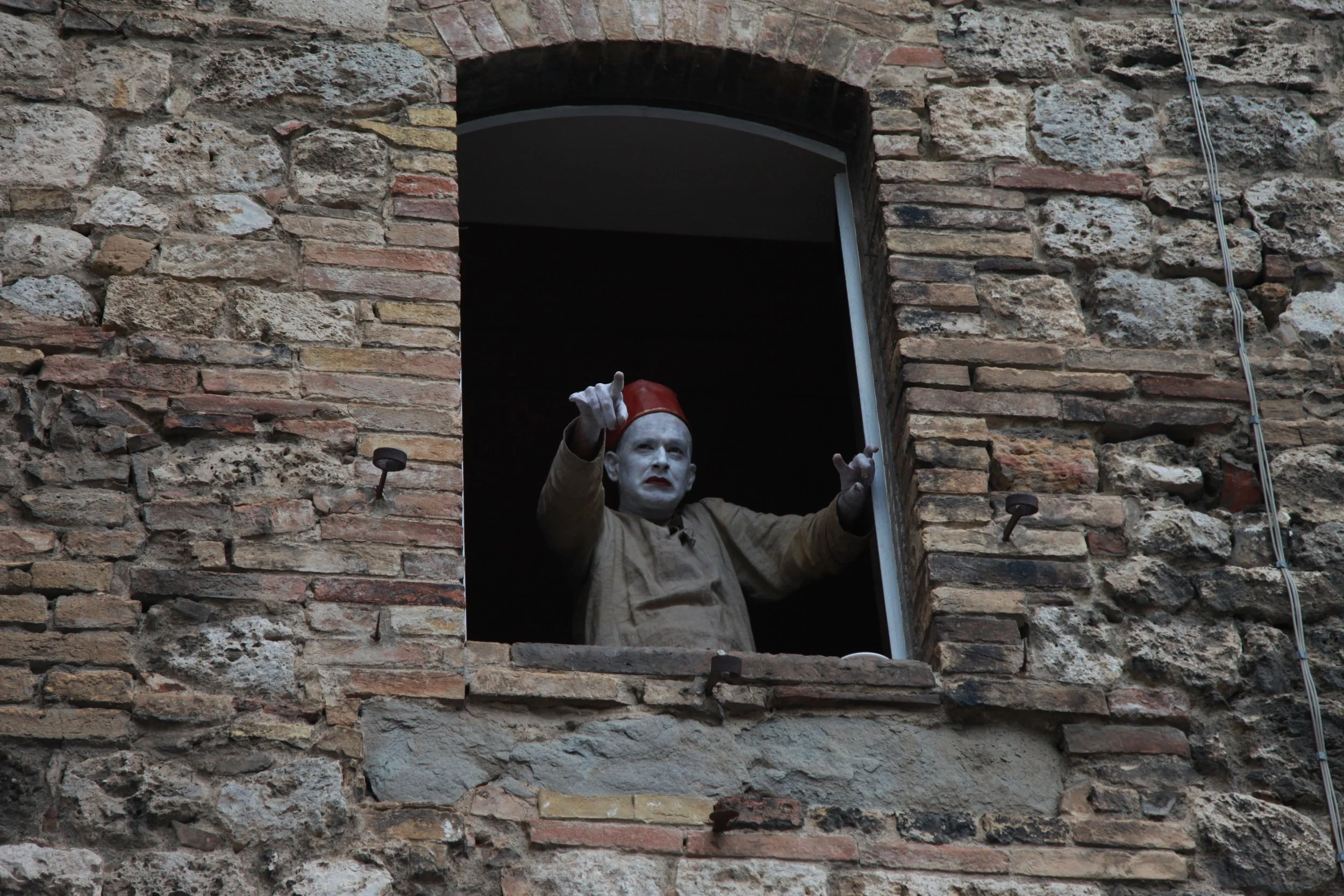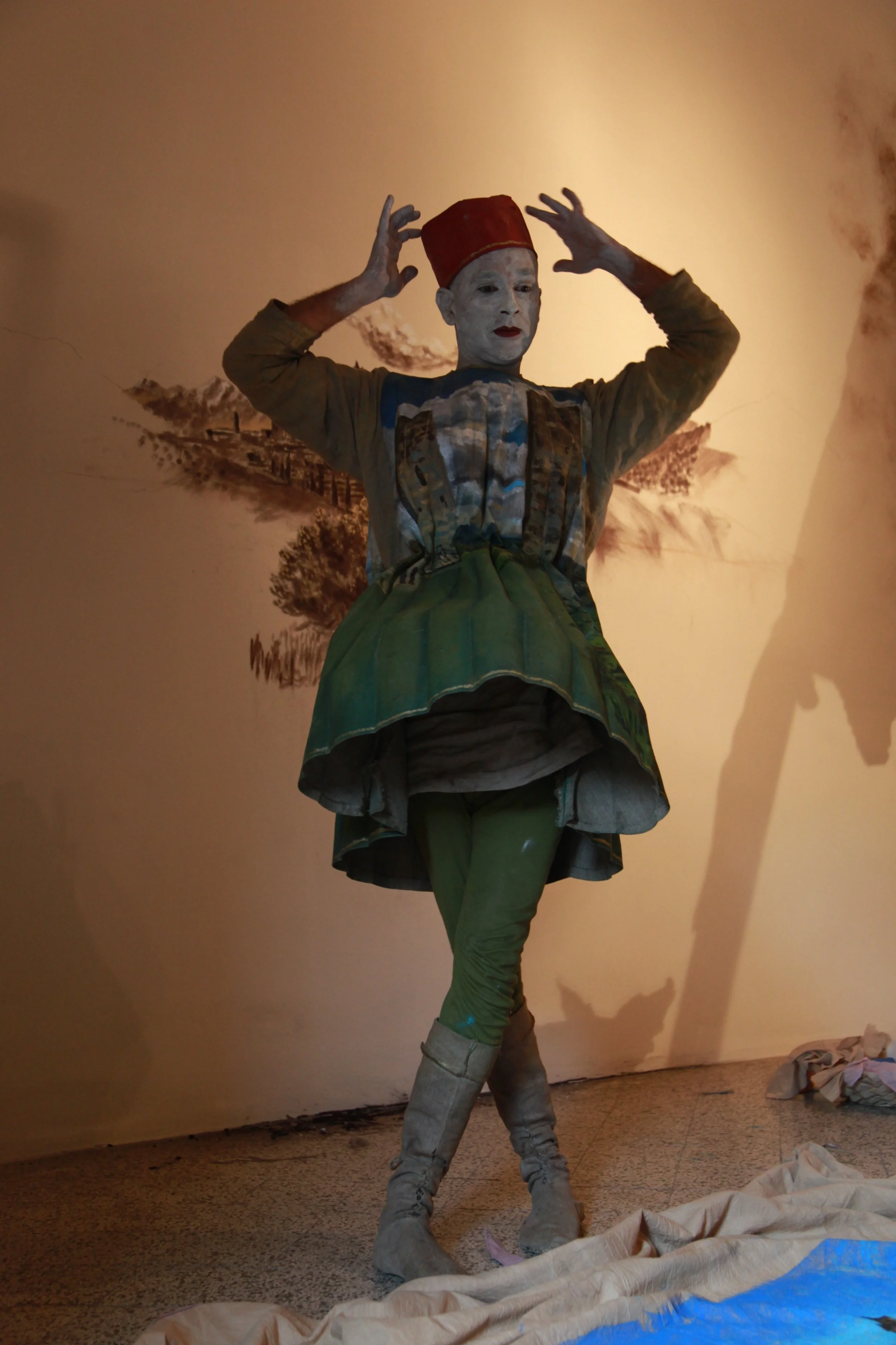 the Church of Sant'Agostino in San Gimignano. Inspired by Gozzoli and his frescos inside out is a site-specific performance conceived by Chopra for the Galleria Continua in San Gimignano. The performance, the longest realized to date by the artist, will last for 99 hours, beginning at 11 am on Wednesday 25 April and ending at 2 pm on Sunday 29 April. During this period of time, the artist will assume the guise of different personae to embody history and memory, and will walk around in the streets of the town and in the surrounding area. In the course of the performance, Chopra will produce a series of drawings of San Gimignano and of the Tuscan landscape. The drawings and their installation will be executed both outside and inside the Arco dei Becci exhibition space, which will be the artist’s abode for the duration of the performance. The installation, the result of four days of performance, will remain on public display until 20 August 2012. The costumes for the performance inside out are designed by Sabine Pfisterer.