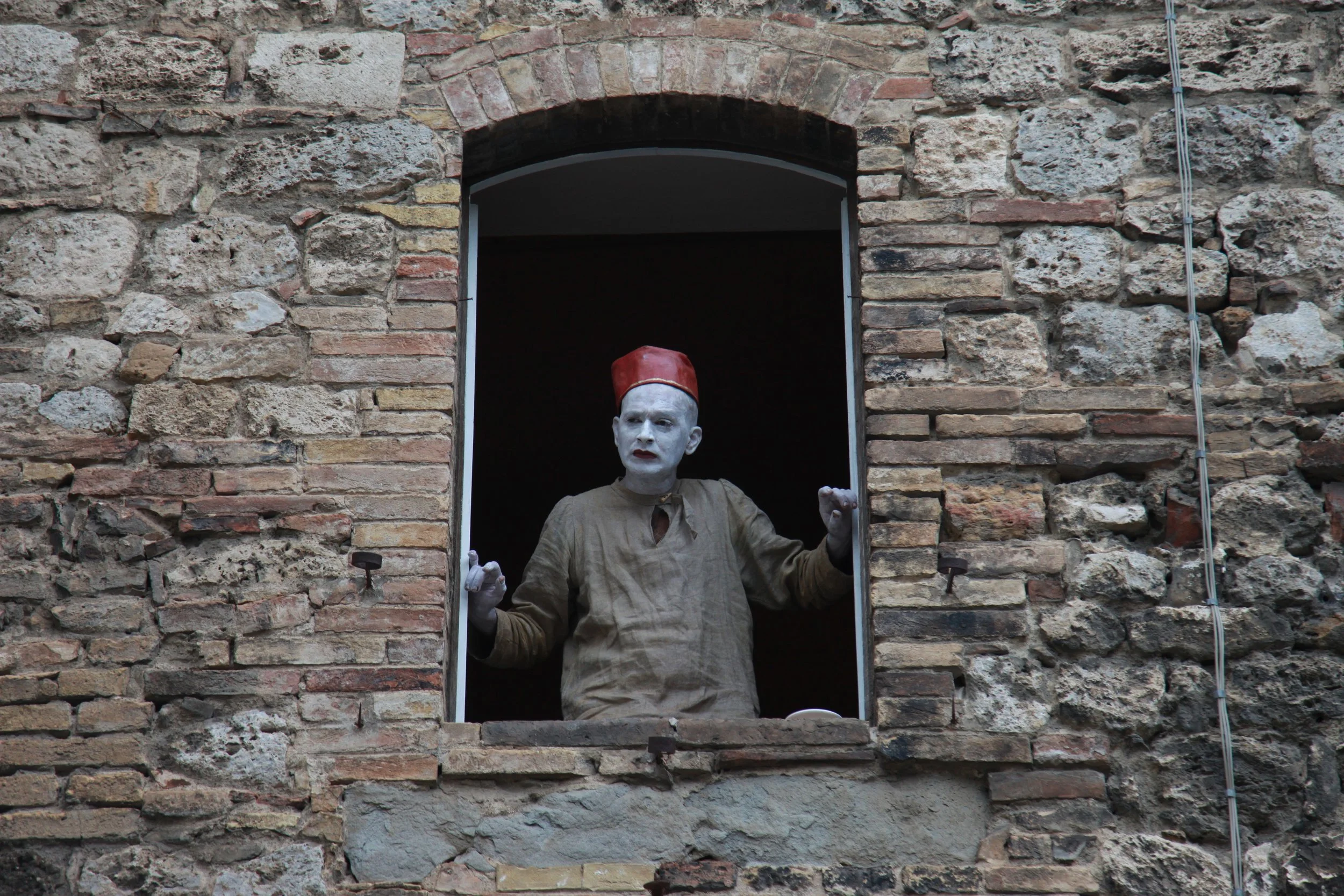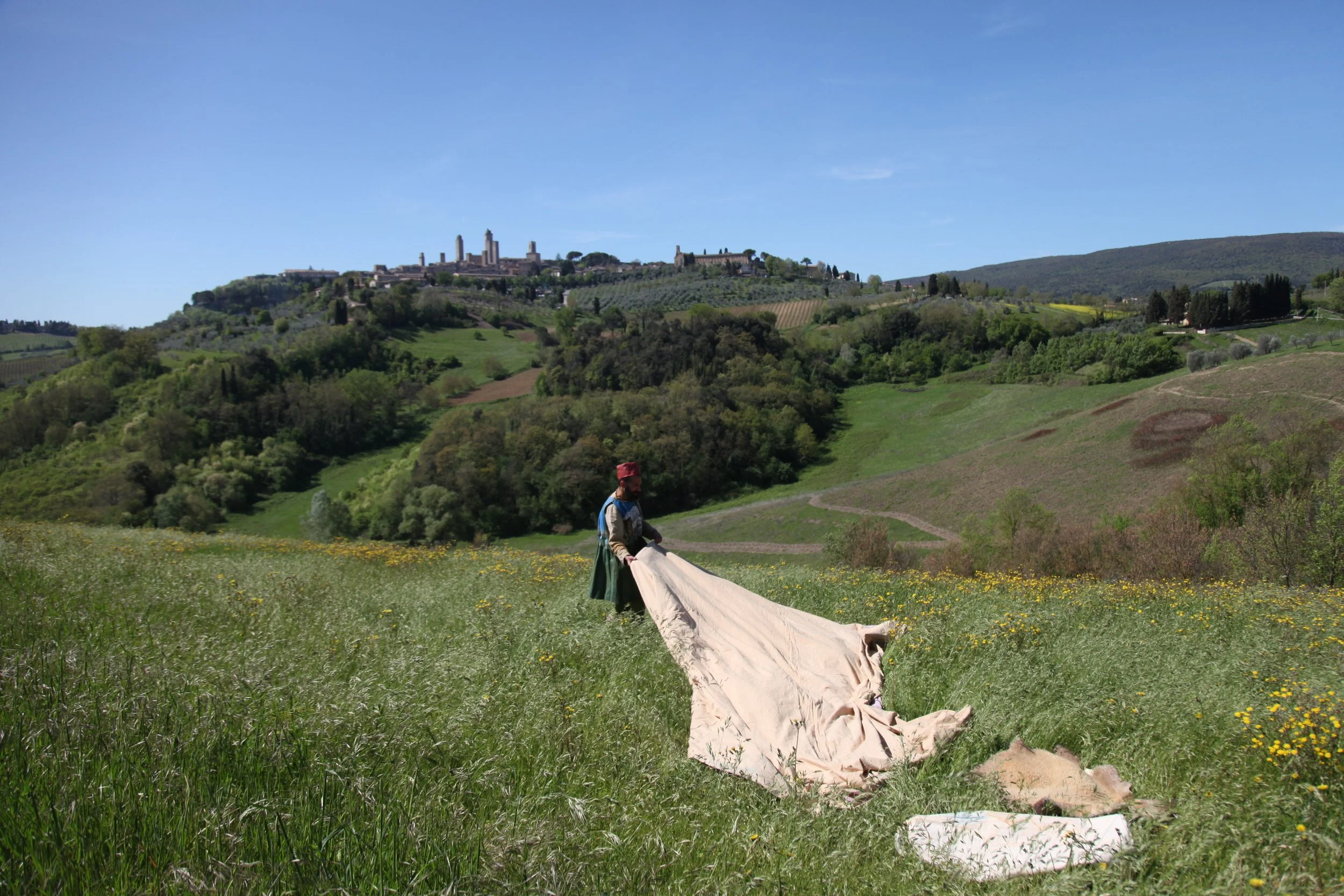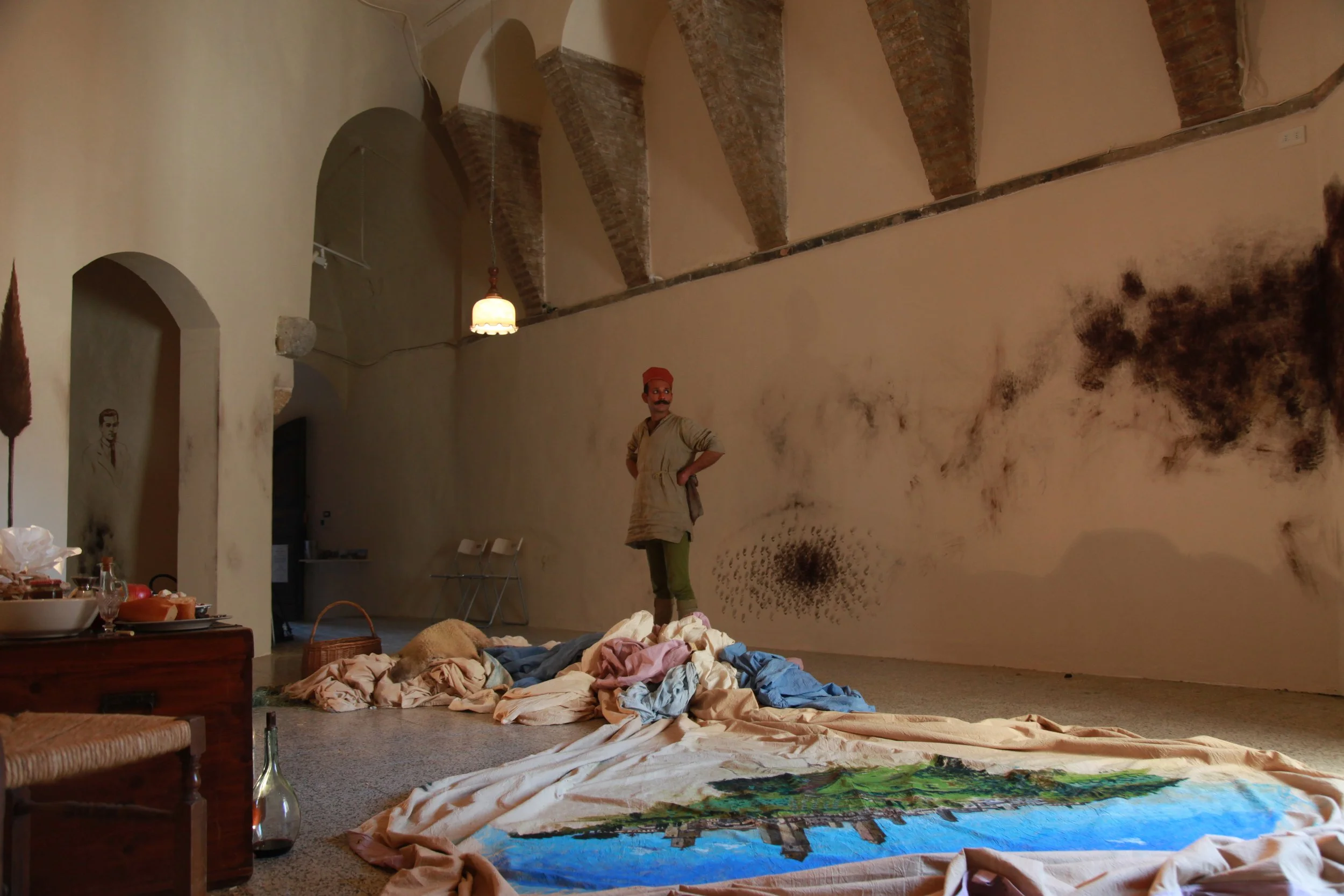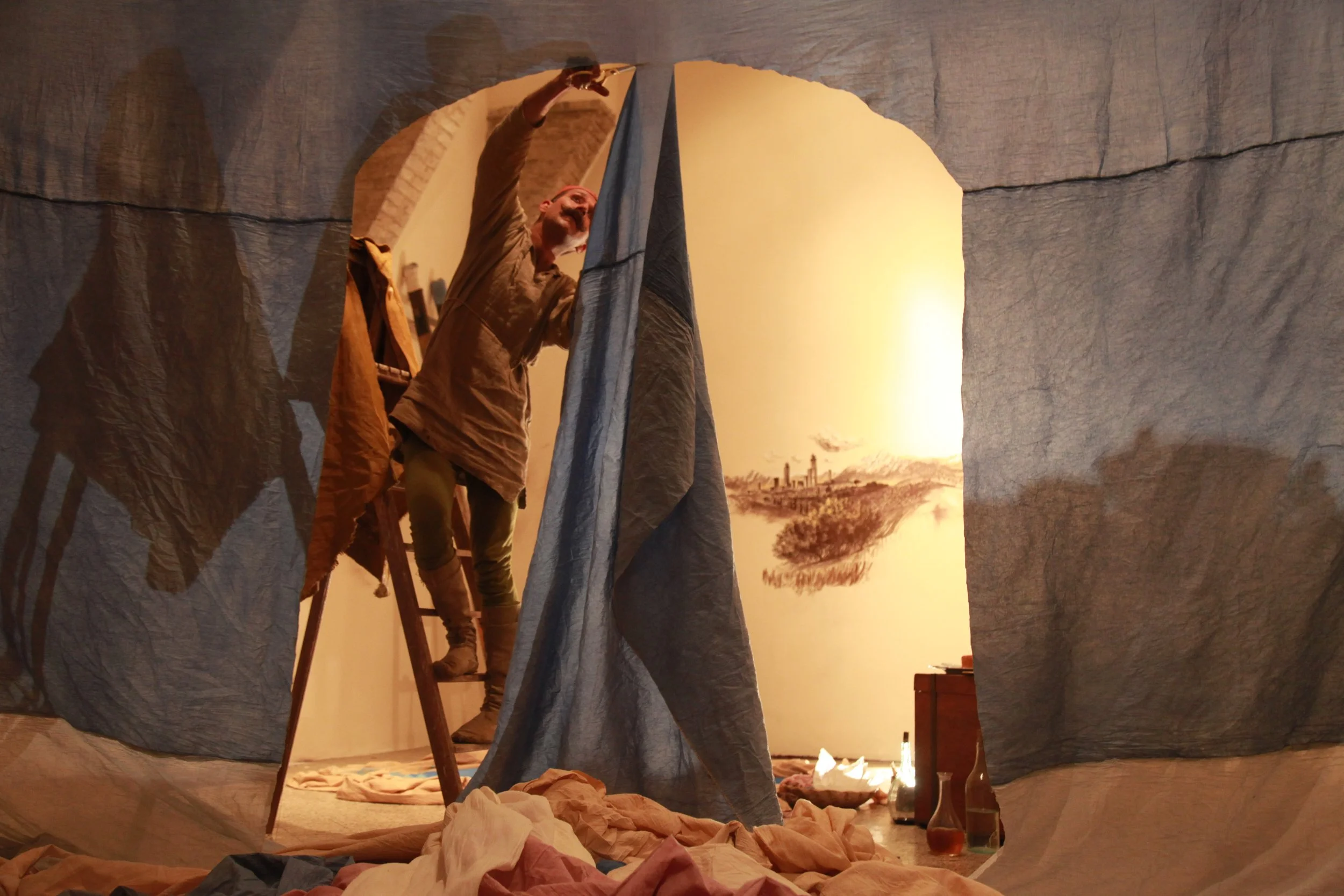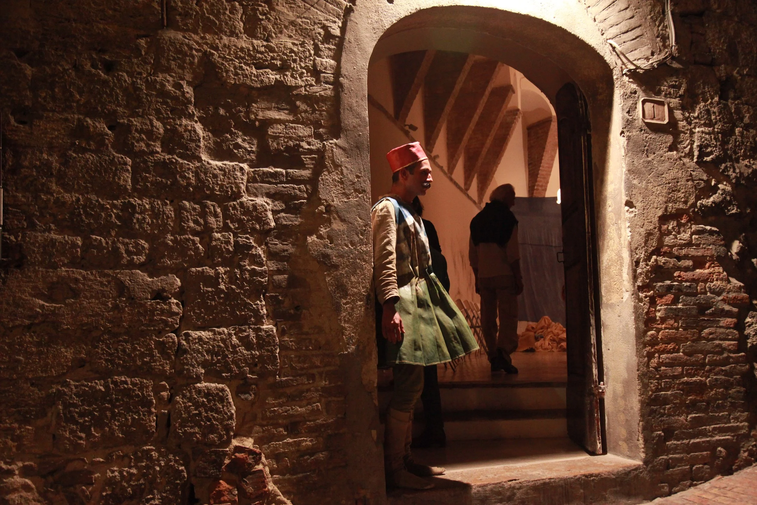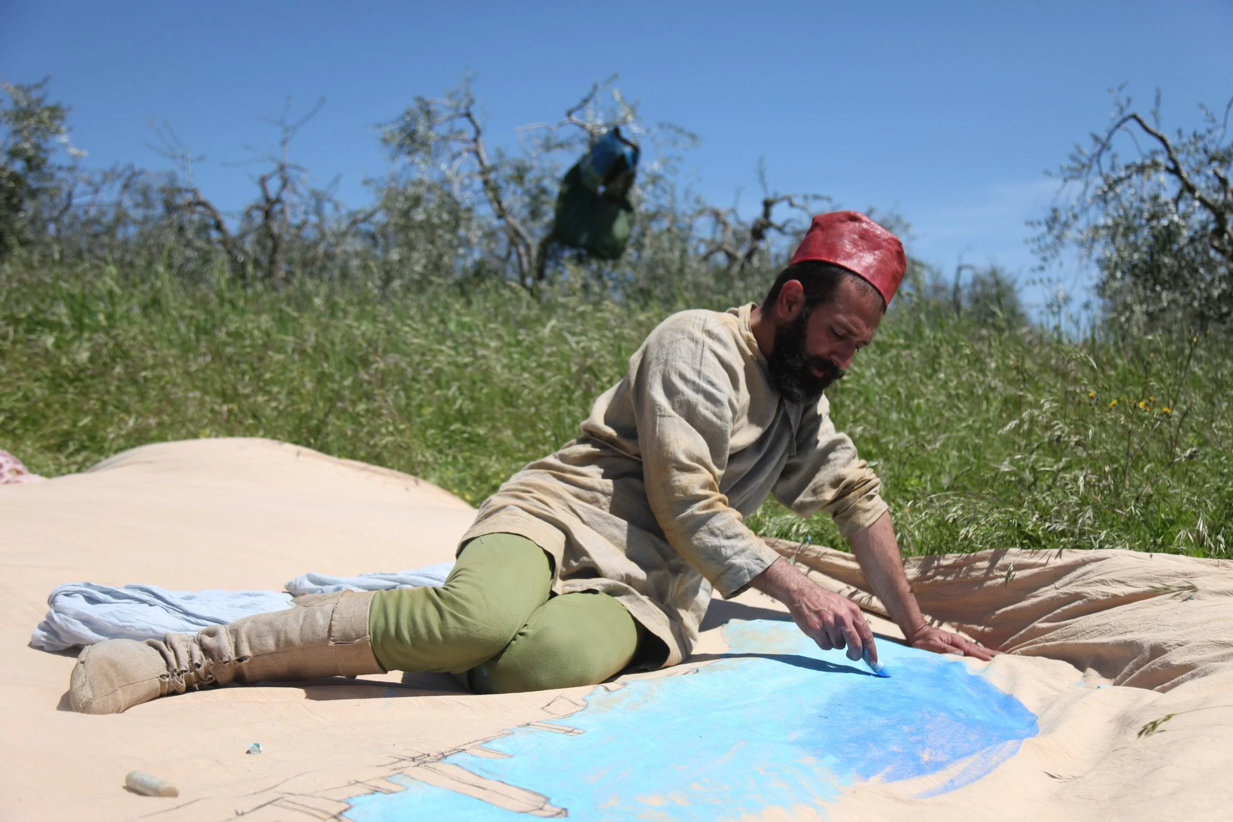 the Church of Sant'Agostino in San Gimignano. Inspired by Gozzoli and his frescos inside out is a site-specific performance conceived by Chopra for the Galleria Continua in San Gimignano. The performance, the longest realized to date by the artist, will last for 99 hours, beginning at 11 am on Wednesday 25 April and ending at 2 pm on Sunday 29 April. During this period of time, the artist will assume the guise of different personae to embody history and memory, and will walk around in the streets of the town and in the surrounding area. In the course of the performance, Chopra will produce a series of drawings of San Gimignano and of the Tuscan landscape. The drawings and their installation will be executed both outside and inside the Arco dei Becci exhibition space, which will be the artist’s abode for the duration of the performance. The installation, the result of four days of performance, will remain on public display until 20 August 2012. The costumes for the performance inside out are designed by Sabine Pfisterer.