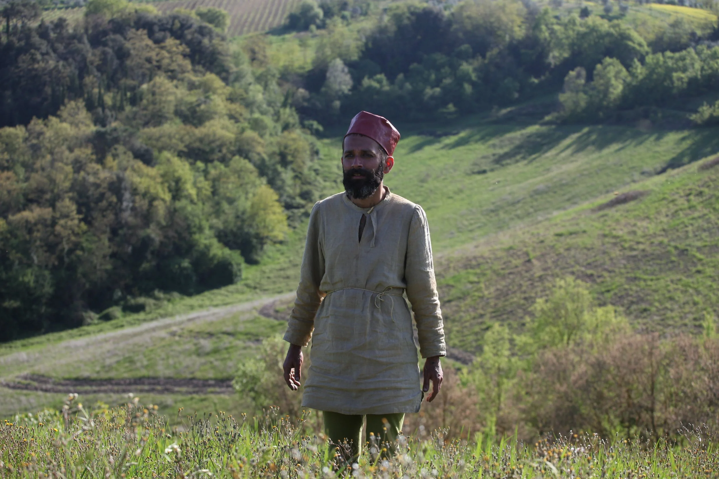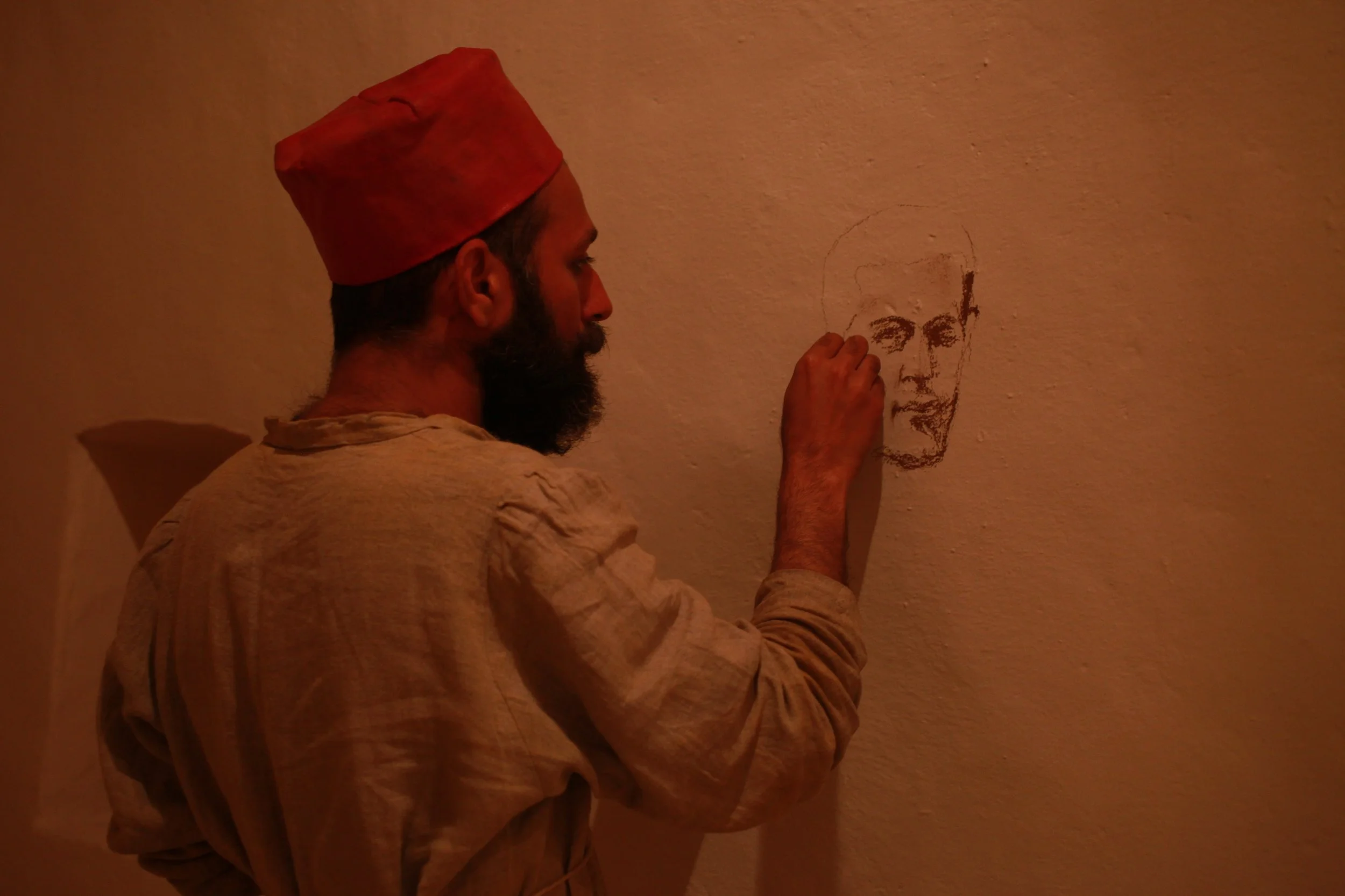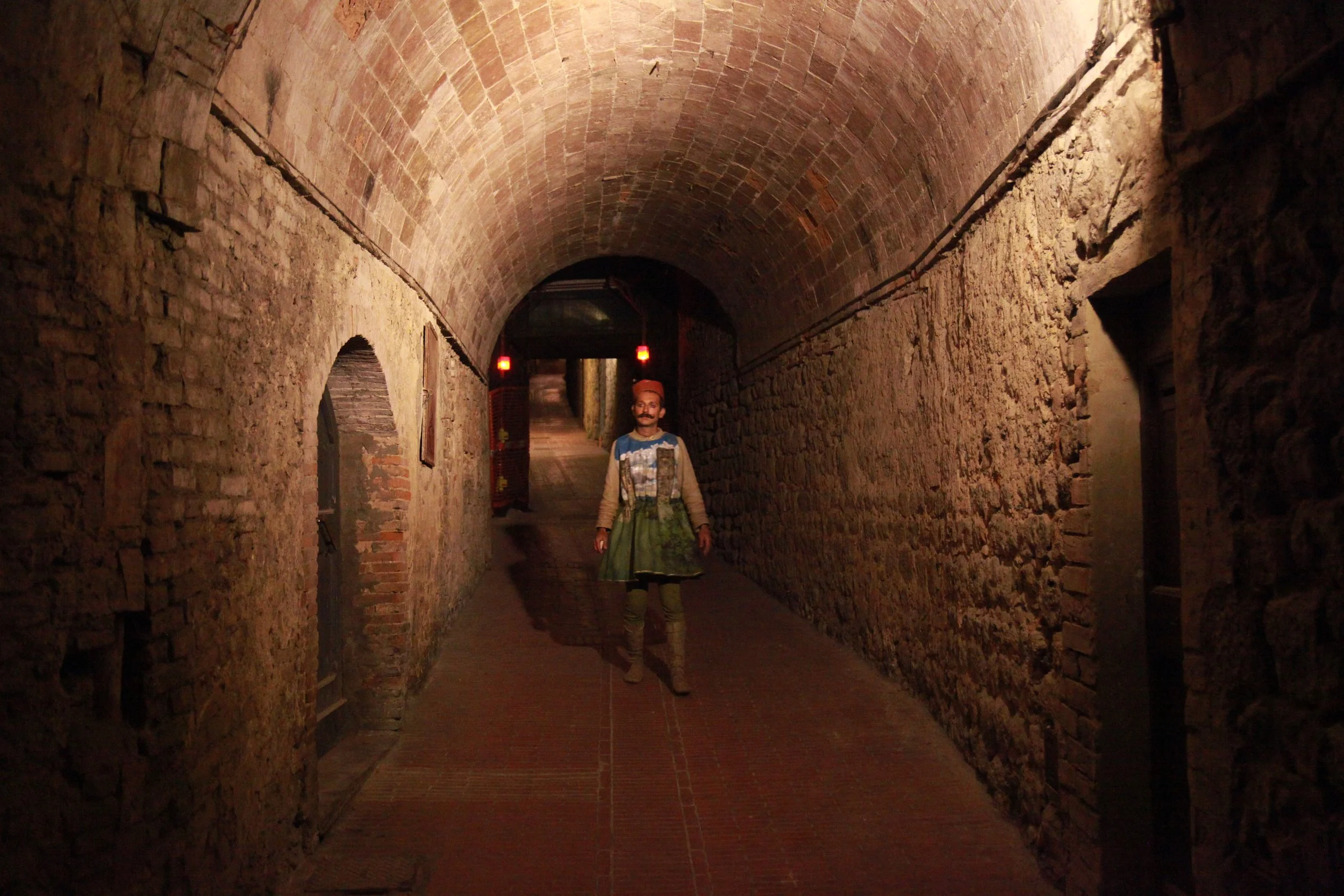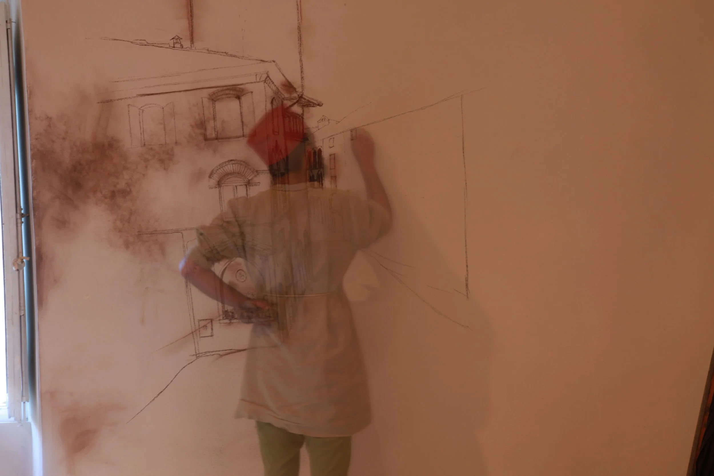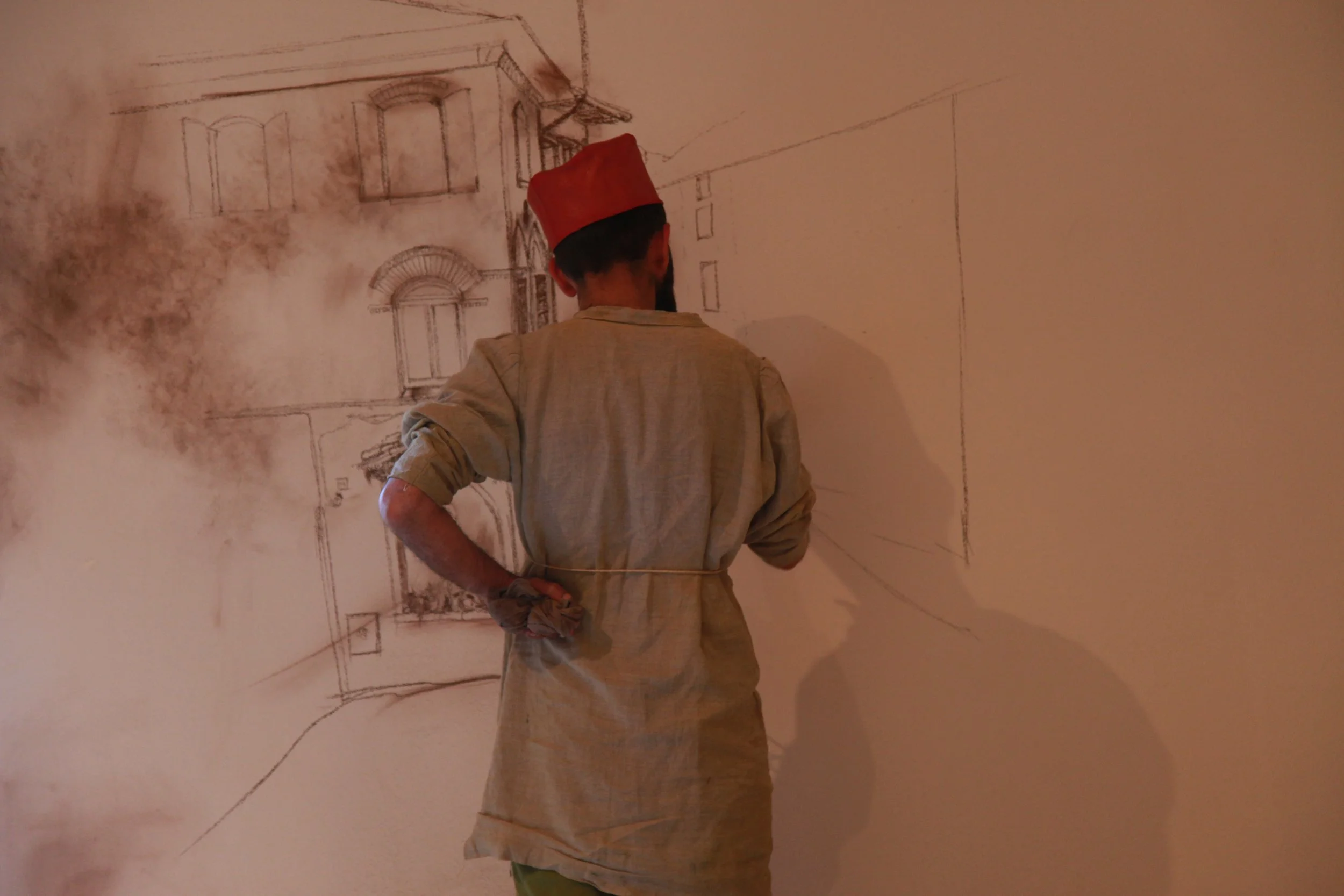 the Church of Sant'Agostino in San Gimignano. Inspired by Gozzoli and his frescos inside out is a site-specific performance conceived by Chopra for the Galleria Continua in San Gimignano. The performance, the longest realized to date by the artist, will last for 99 hours, beginning at 11 am on Wednesday 25 April and ending at 2 pm on Sunday 29 April. During this period of time, the artist will assume the guise of different personae to embody history and memory, and will walk around in the streets of the town and in the surrounding area. In the course of the performance, Chopra will produce a series of drawings of San Gimignano and of the Tuscan landscape. The drawings and their installation will be executed both outside and inside the Arco dei Becci exhibition space, which will be the artist’s abode for the duration of the performance. The installation, the result of four days of performance, will remain on public display until 20 August 2012. The costumes for the performance inside out are designed by Sabine Pfisterer.