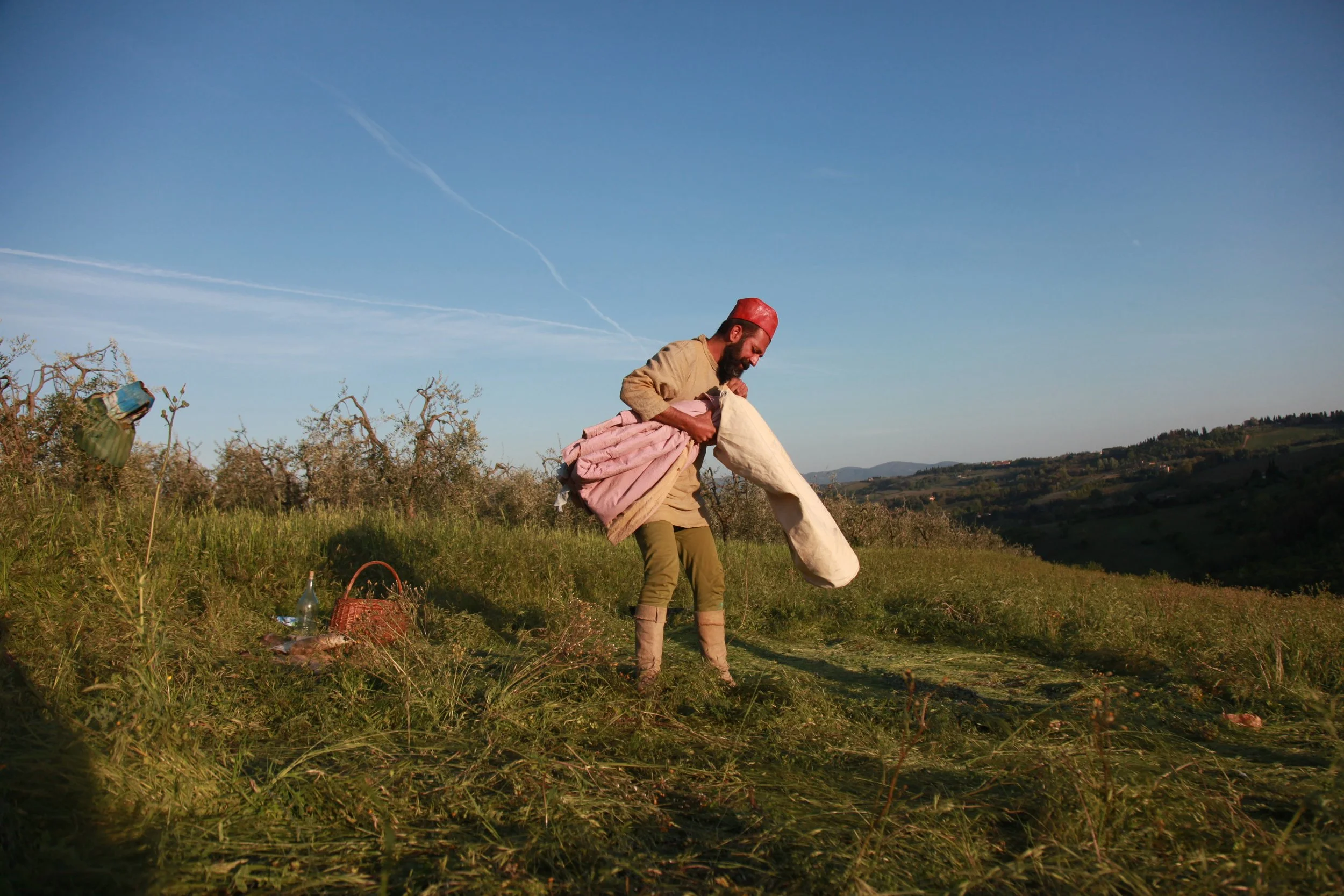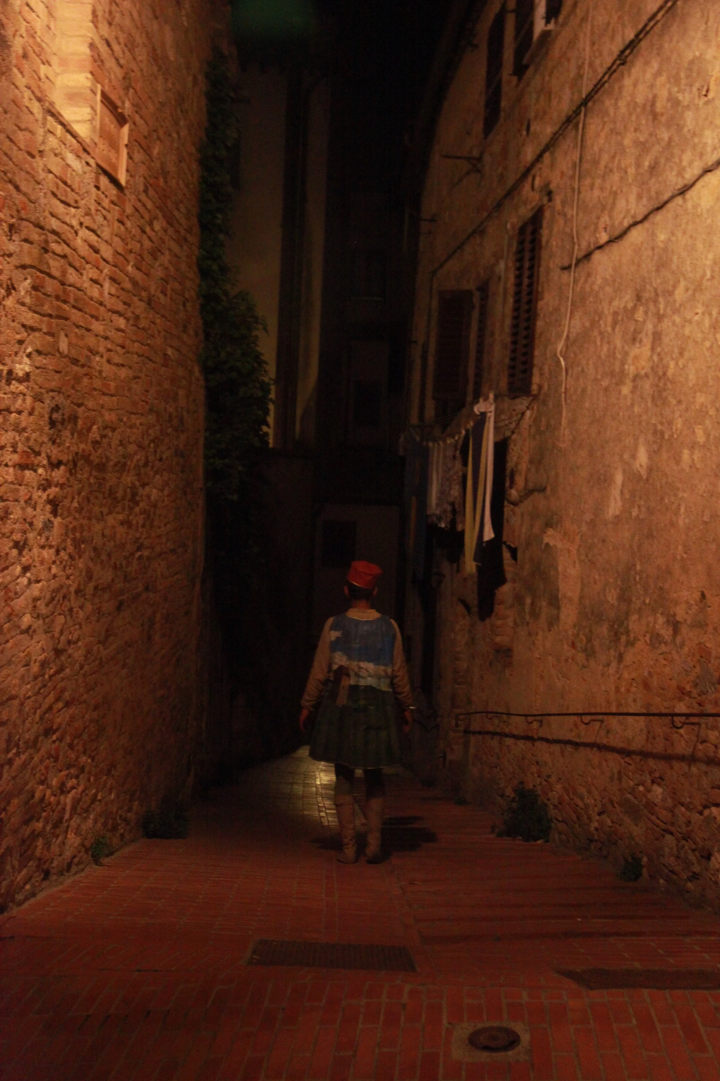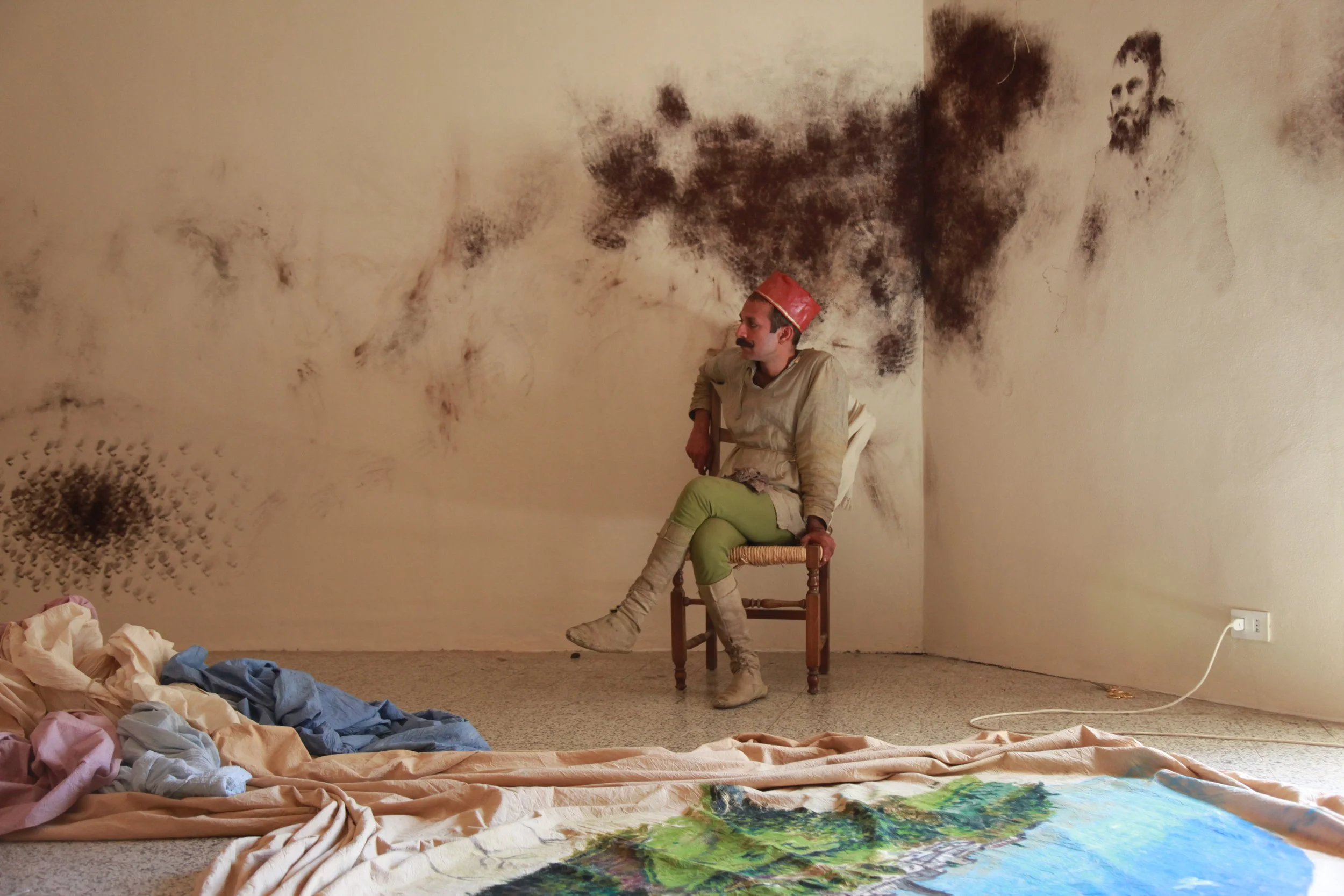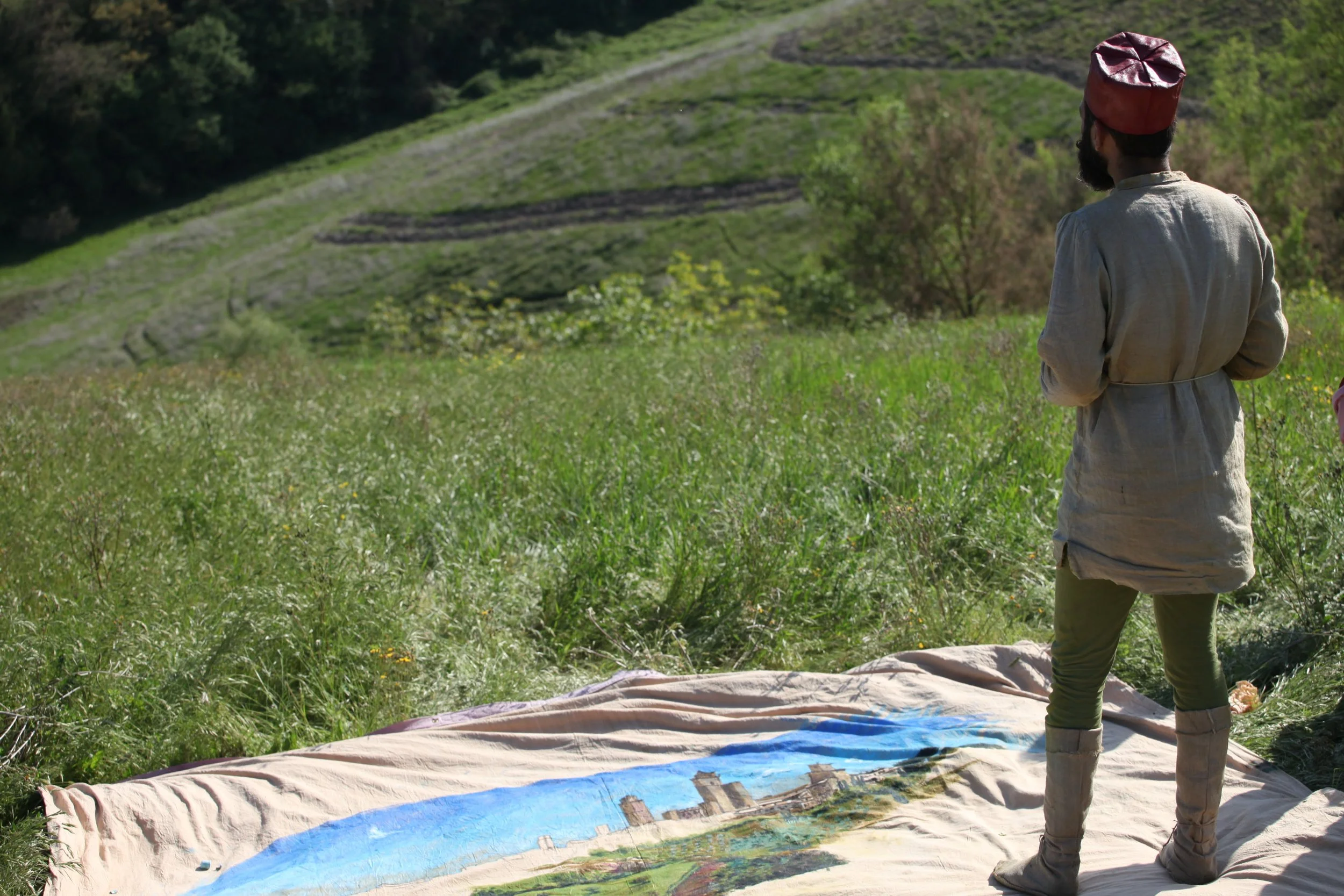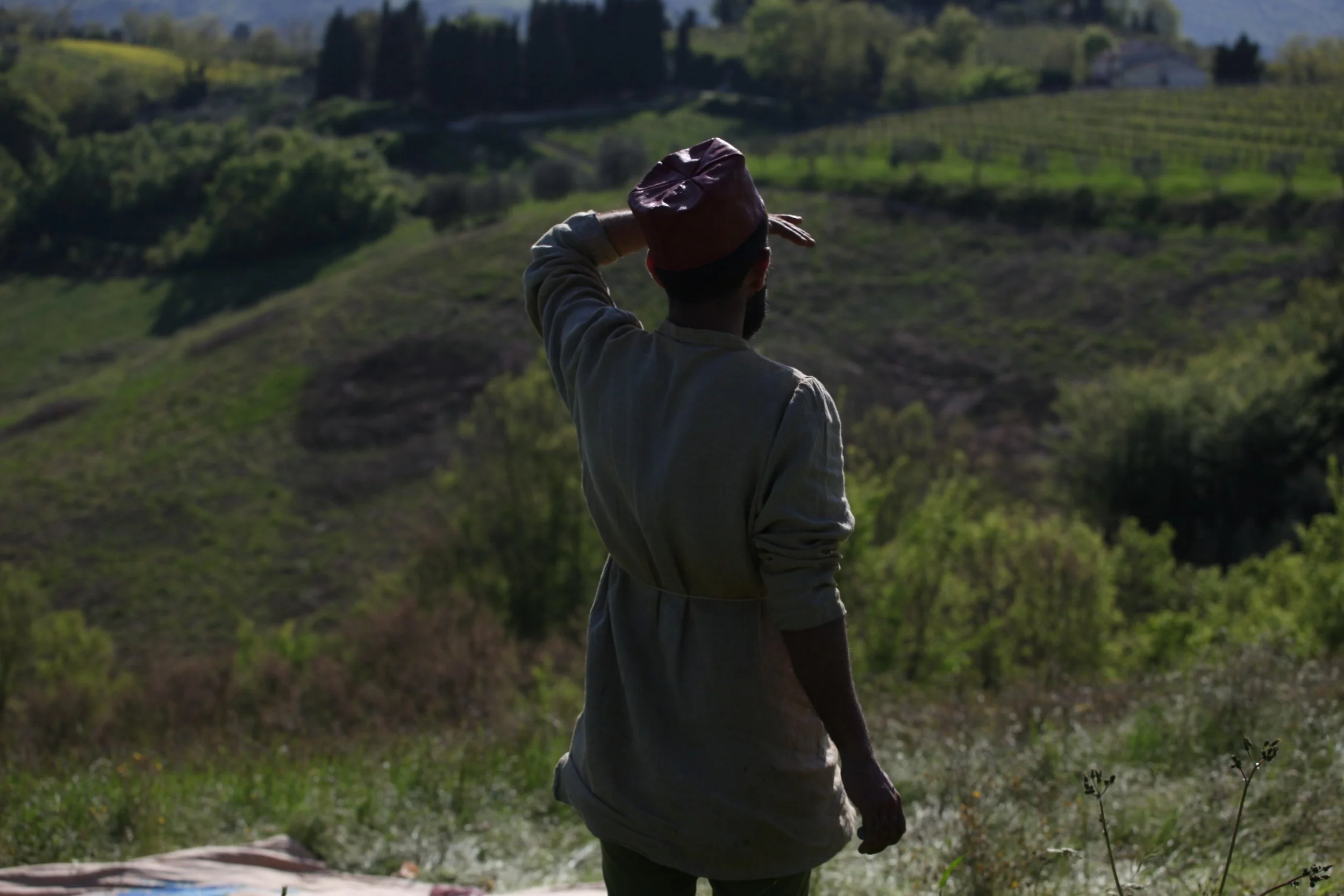 the Church of Sant'Agostino in San Gimignano. Inspired by Gozzoli and his frescos inside out is a site-specific performance conceived by Chopra for the Galleria Continua in San Gimignano. The performance, the longest realized to date by the artist, will last for 99 hours, beginning at 11 am on Wednesday 25 April and ending at 2 pm on Sunday 29 April. During this period of time, the artist will assume the guise of different personae to embody history and memory, and will walk around in the streets of the town and in the surrounding area. In the course of the performance, Chopra will produce a series of drawings of San Gimignano and of the Tuscan landscape. The drawings and their installation will be executed both outside and inside the Arco dei Becci exhibition space, which will be the artist’s abode for the duration of the performance. The installation, the result of four days of performance, will remain on public display until 20 August 2012. The costumes for the performance inside out are designed by Sabine Pfisterer.