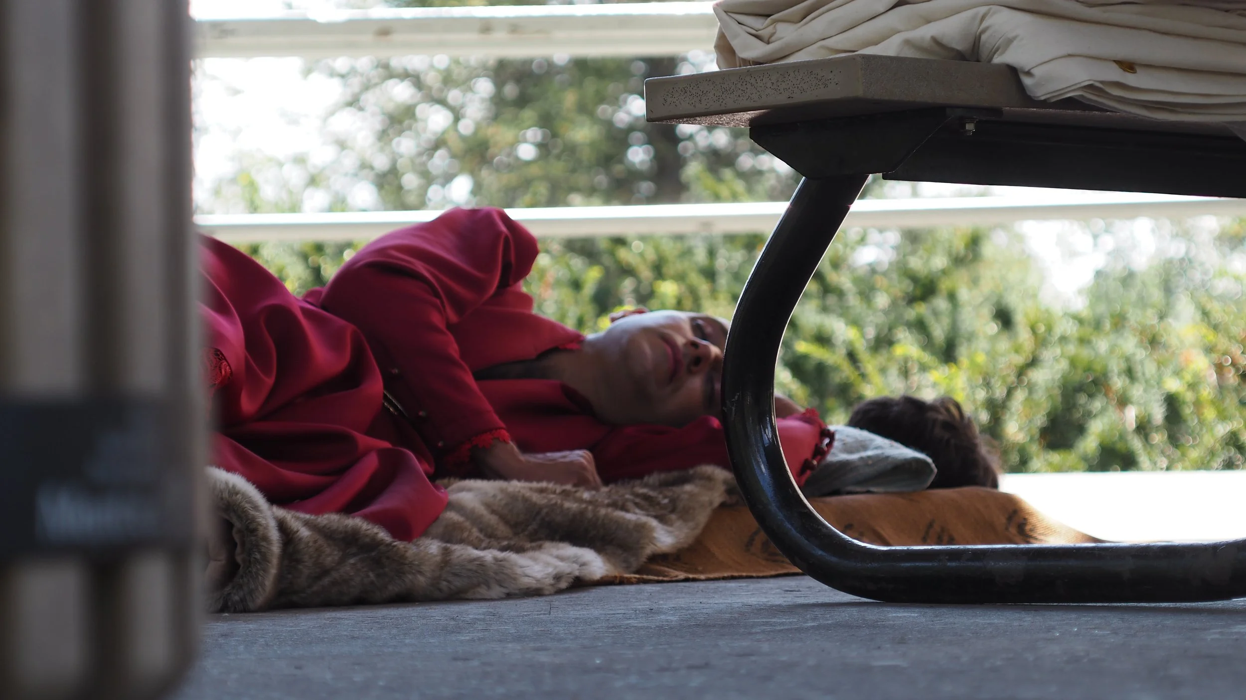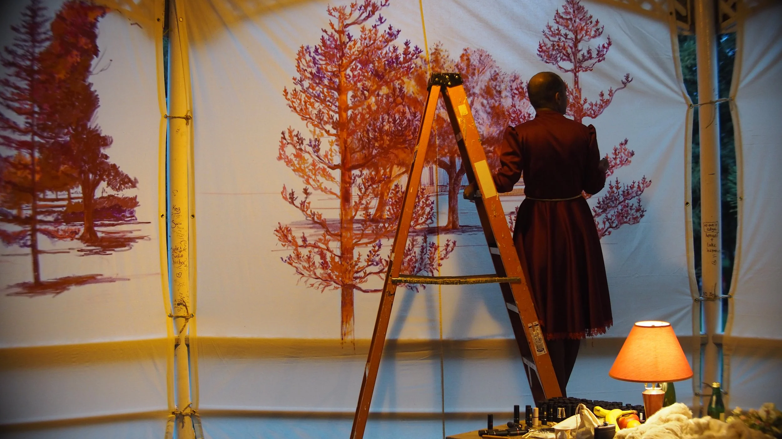 Working with Concordia faculty member and curator Renée Baert, Chopra performed for 57 hours from September 18 to 20 2015 in a Gazebo at Jarry Park where he camped and drew with lipstick on large canvases of what he could see surrounding his temporary shelter. The drawings were displayed at the end at the FOFA Gallery. The installation echoed the gazebo, and as a gesture of making an exit from his performance, he transforms into the image of a 1980s rock musician .